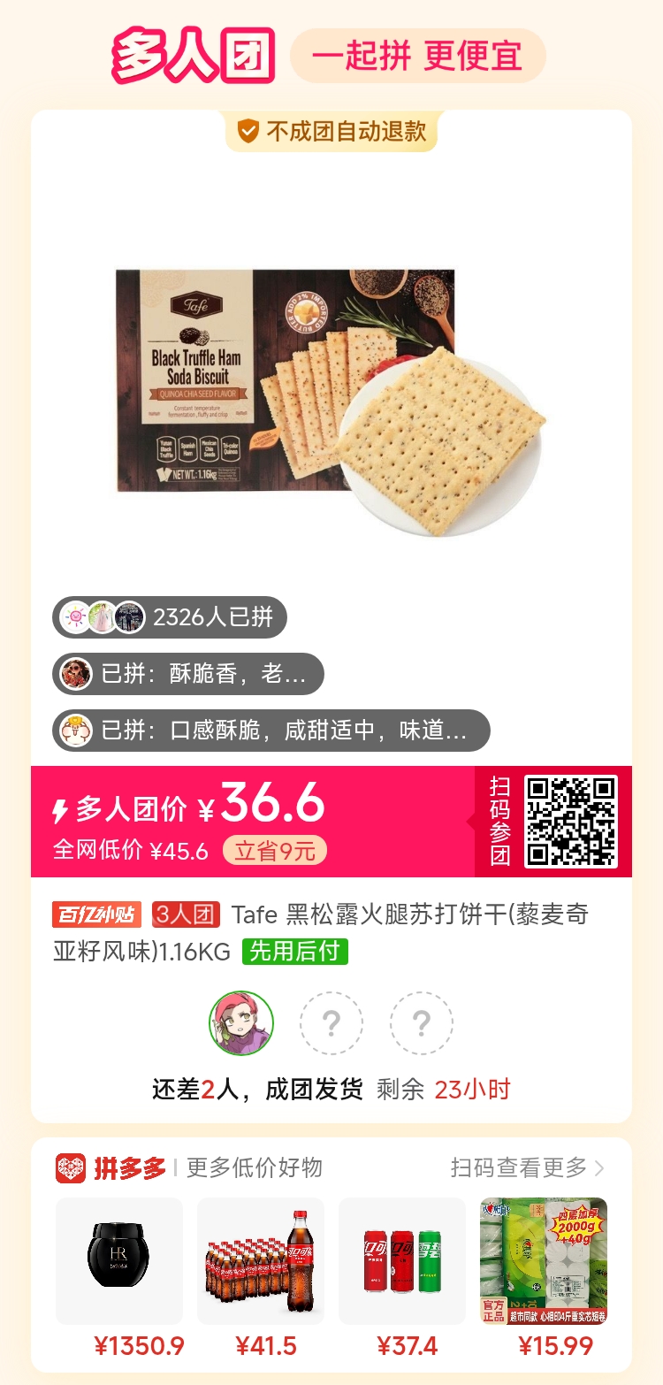 8:/⇥IDBb2gyO9WmIy⇤ 复制并打开拼多多APP,36.6元拼团购买Tafe 黑松露火腿苏打饼干(藜麦奇亚籽...,仅剩2个名额