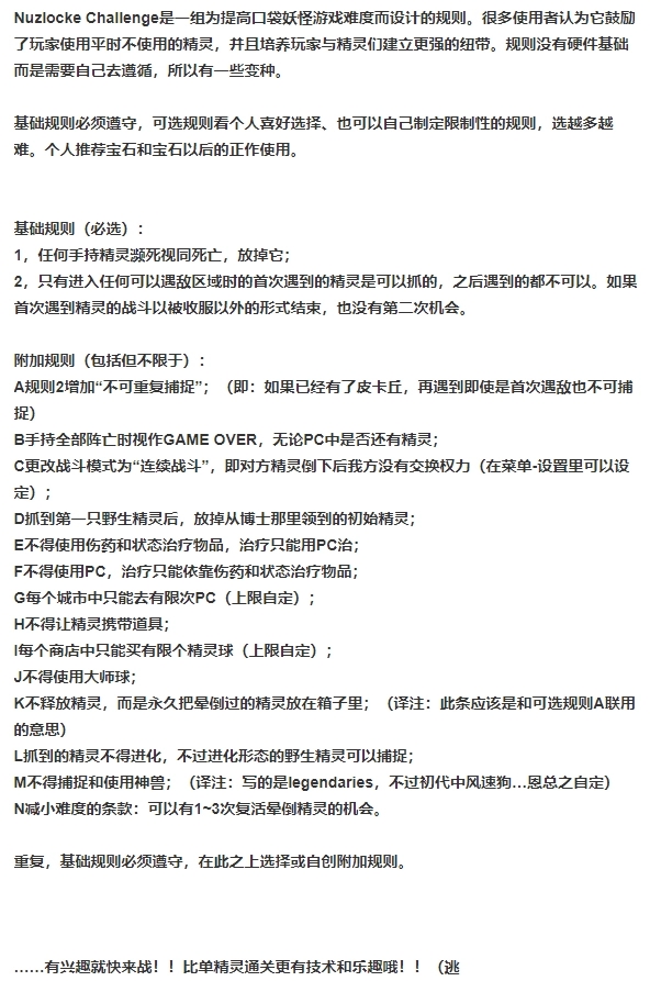 关于Nuzlocke的介绍如图所示,出于对我对战实力的正确认识,我结合图上的内容,设计了如下规则: