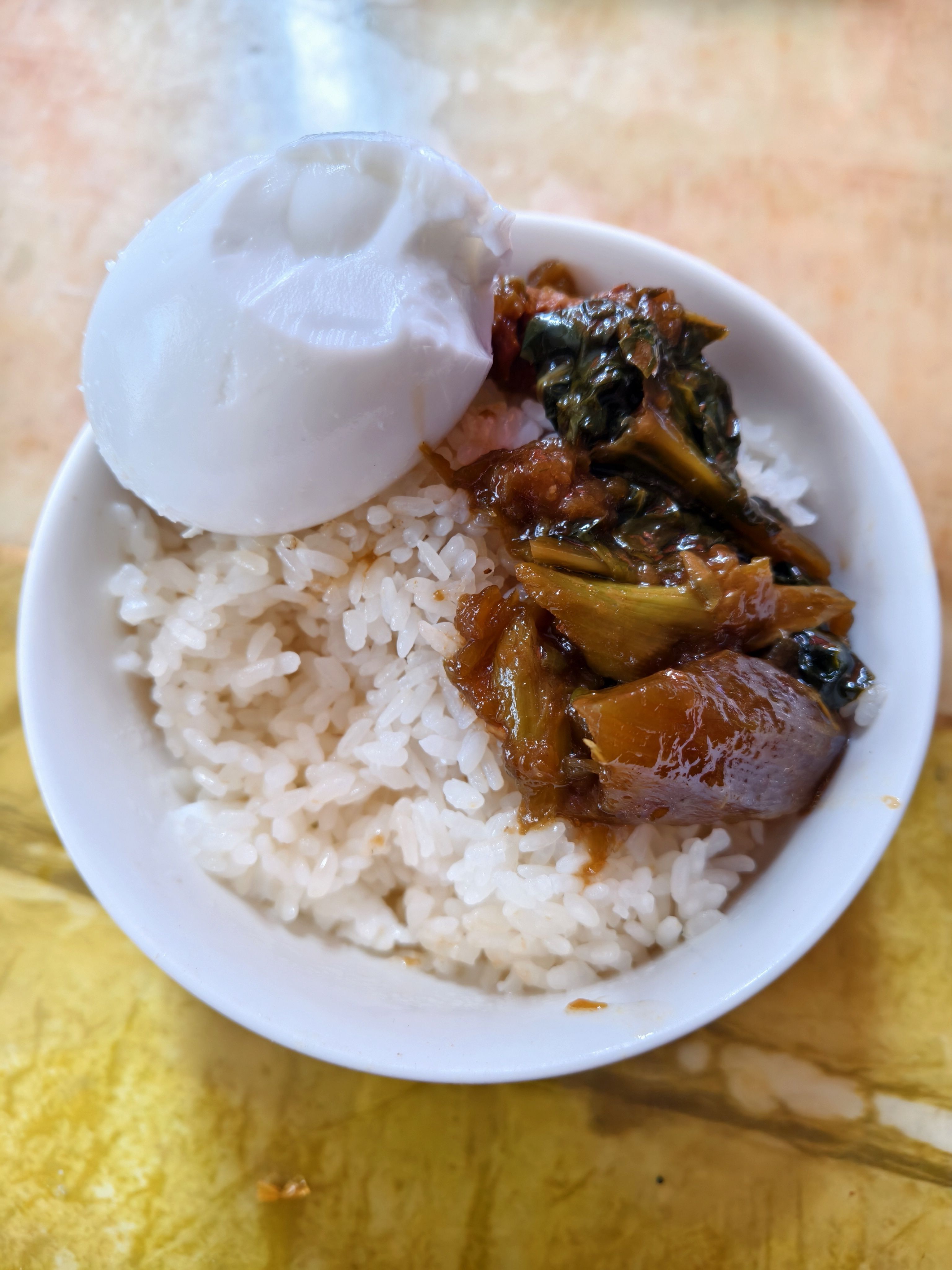 午饭:一碗米饭,一只不咸的自腌鸭蛋,一点莴苣烧肉