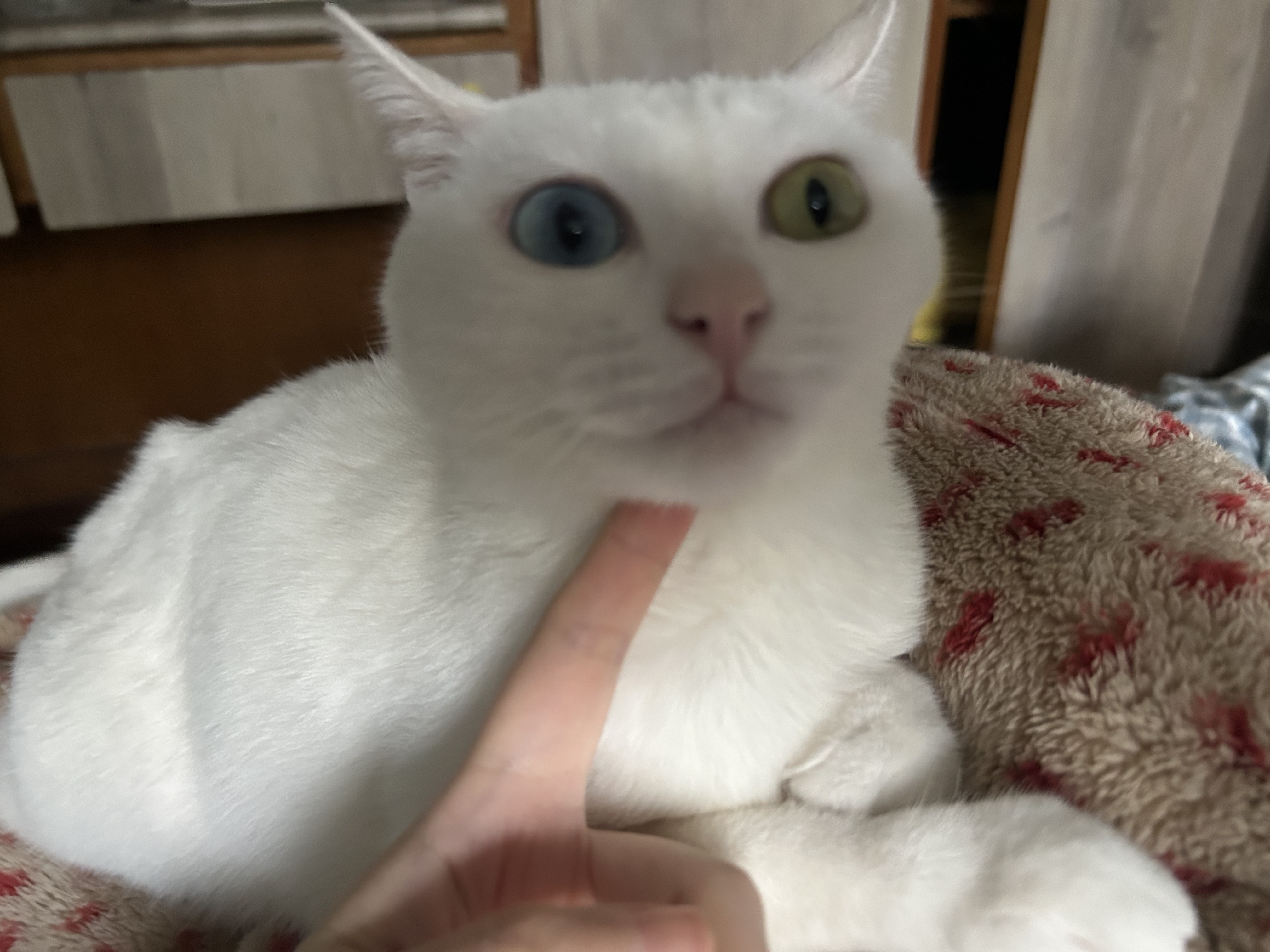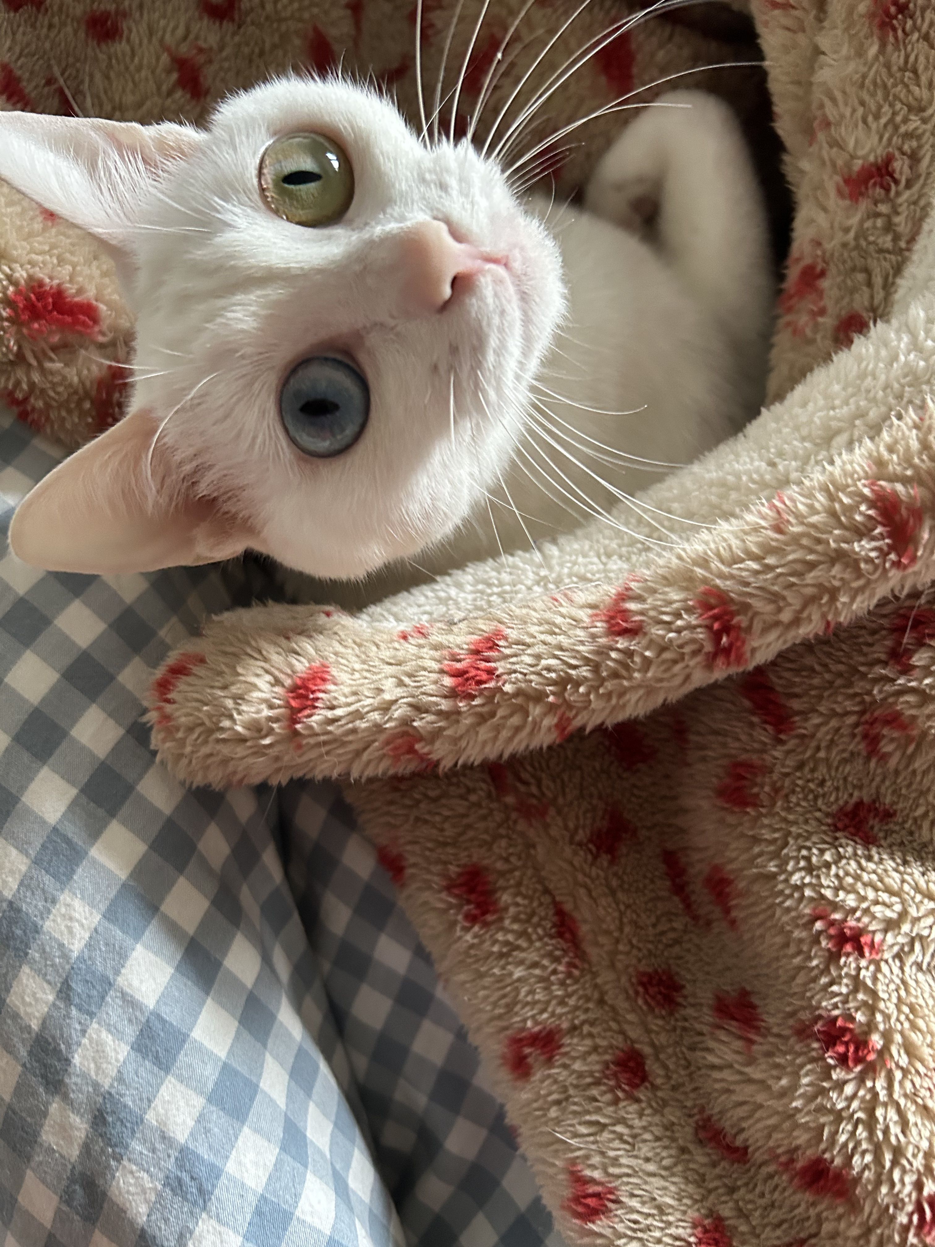 晚上的时候吃了一大堆猫粮,又喝了水,然后在家里跑酷,不舒服没忍住就吐在我床单上了,还好我正准备换新的,就把门关起来换掉了,一开门就着急跑进来在刚刚那片一直刨,想帮我清理,我知道她不是故意的,之前幽门严重的时候吐的多,偷偷吐在角落都不会吐在人休息的地方,害怕被我发现生她气,她真的是个好孩子