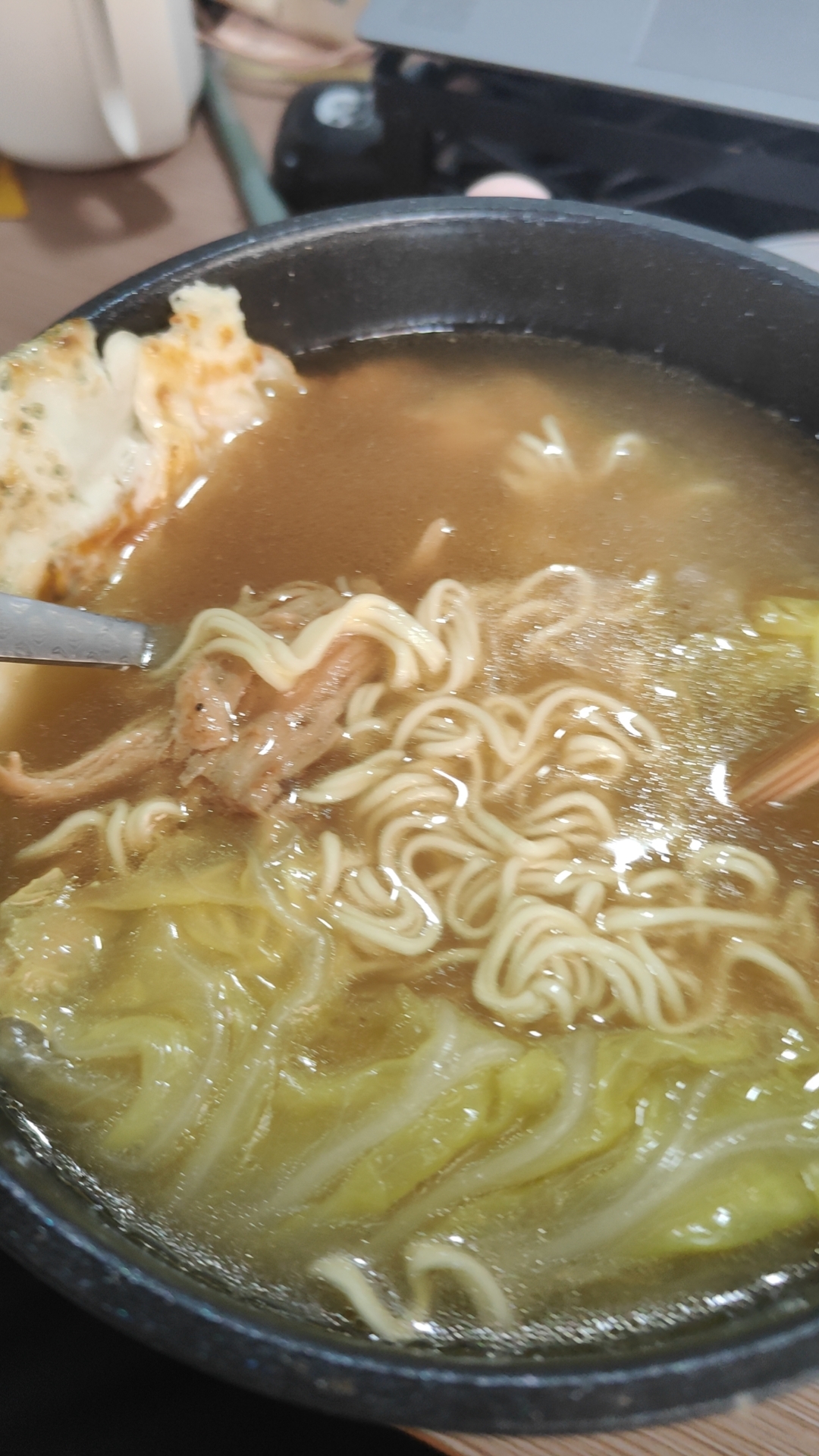 做饭新手初次煎肉,味道意外还不错,除了酱油放得有些多,但倒在汤面里后就好了不少