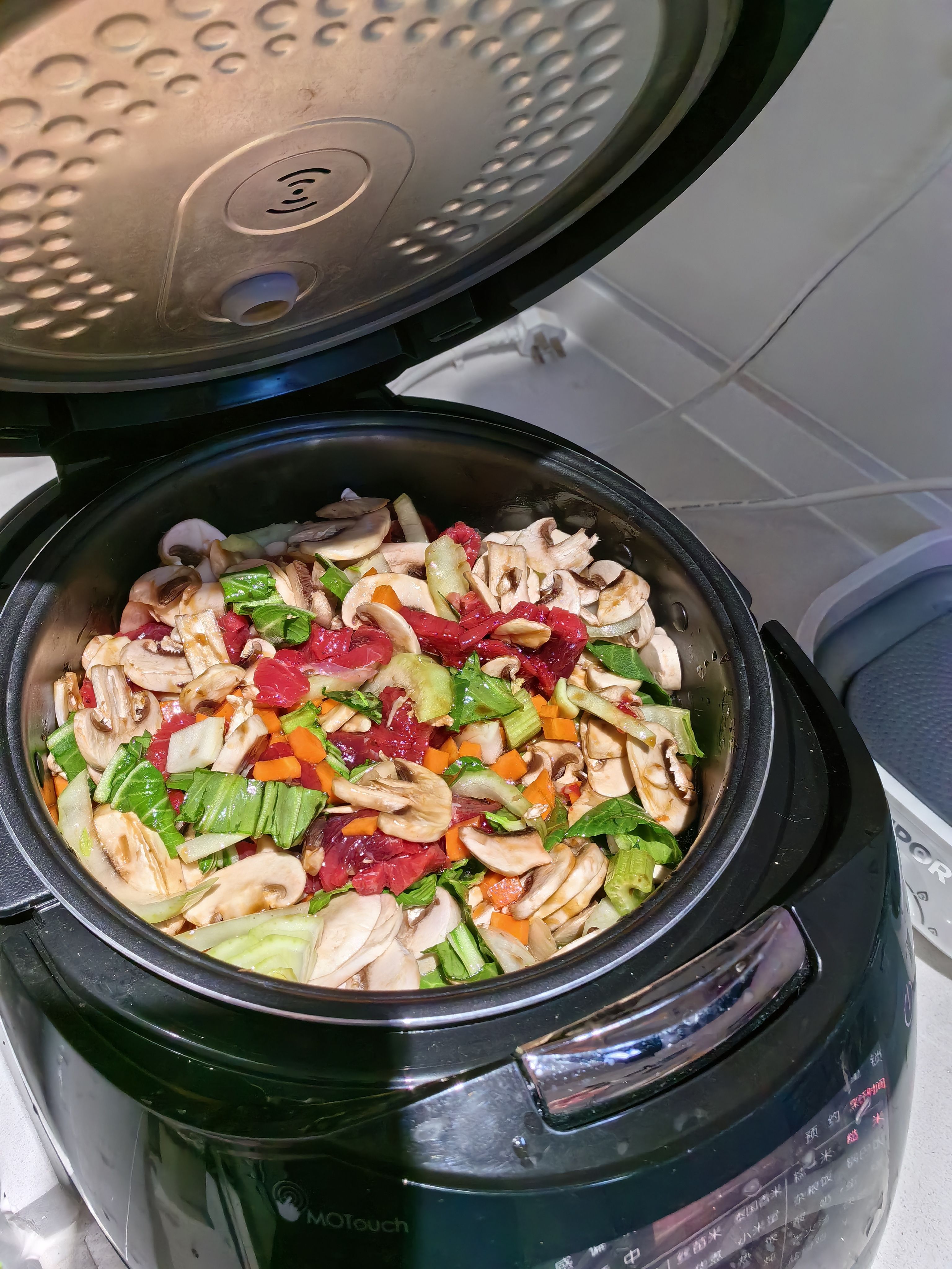 找到了喜欢的主食风格,糙米+大麦米+三色藜麦+一份豌豆再加一份冰冻的综合蔬菜进电饭锅煮,煮完之后加一点用酱油鸡粉炒的蘑菇,吃起来口感很有意思
