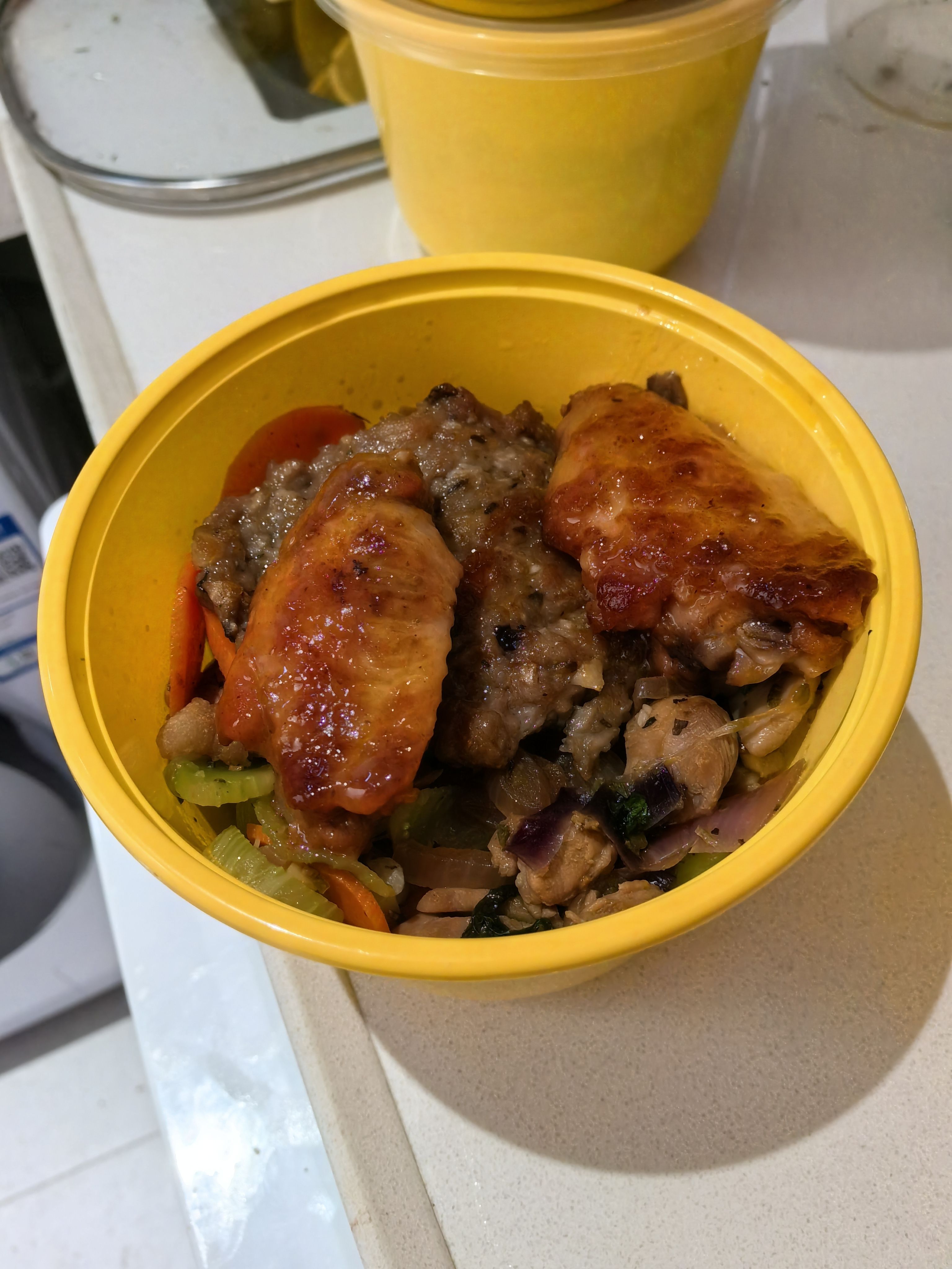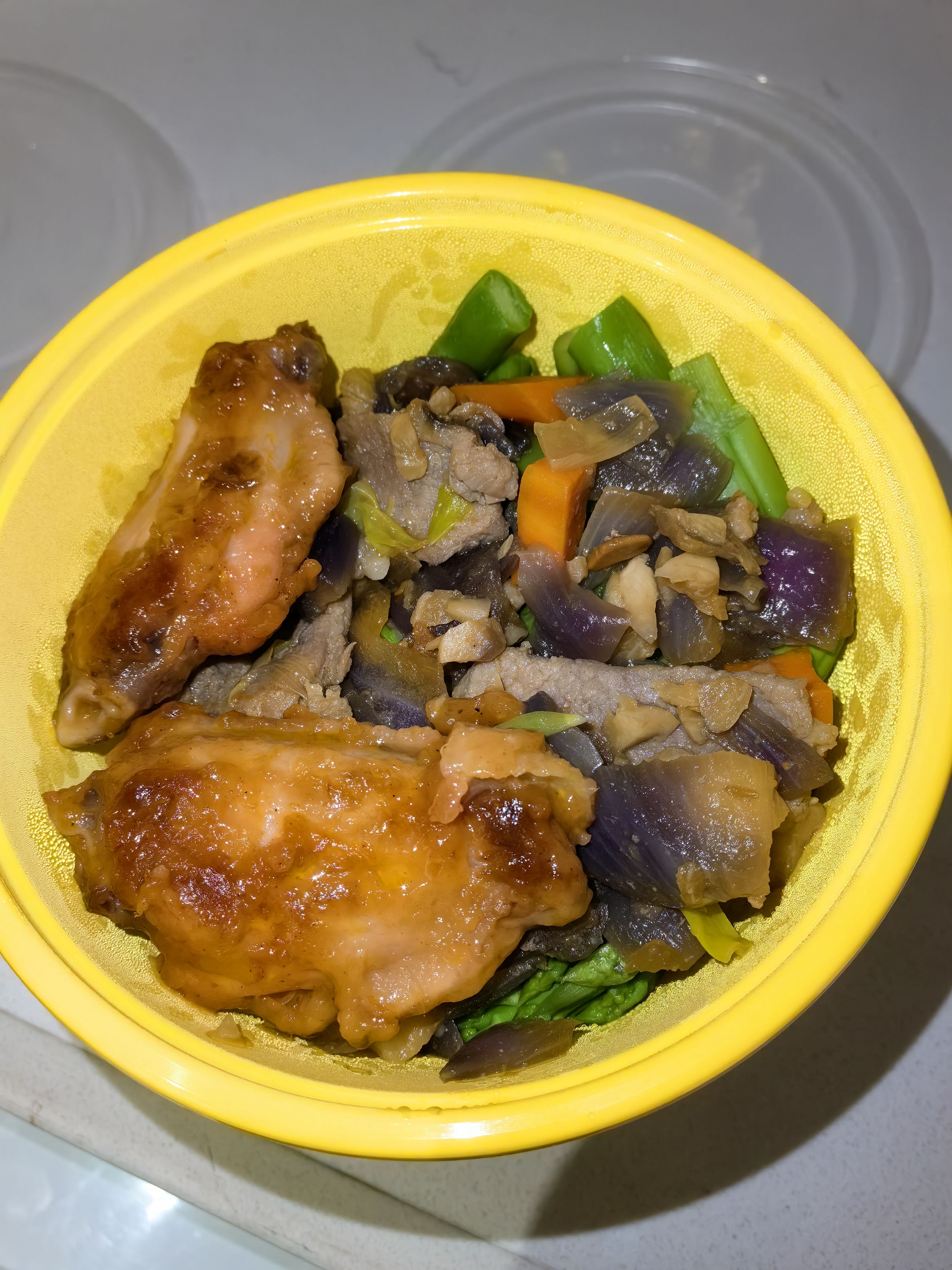 柠檬炒鸡+莴笋胡萝卜洋葱炒肉+香菇马蹄肉饼+蒜香鸡翅+杂粮饭,一共做了七份,平均下来每份17块左右,有点贵了