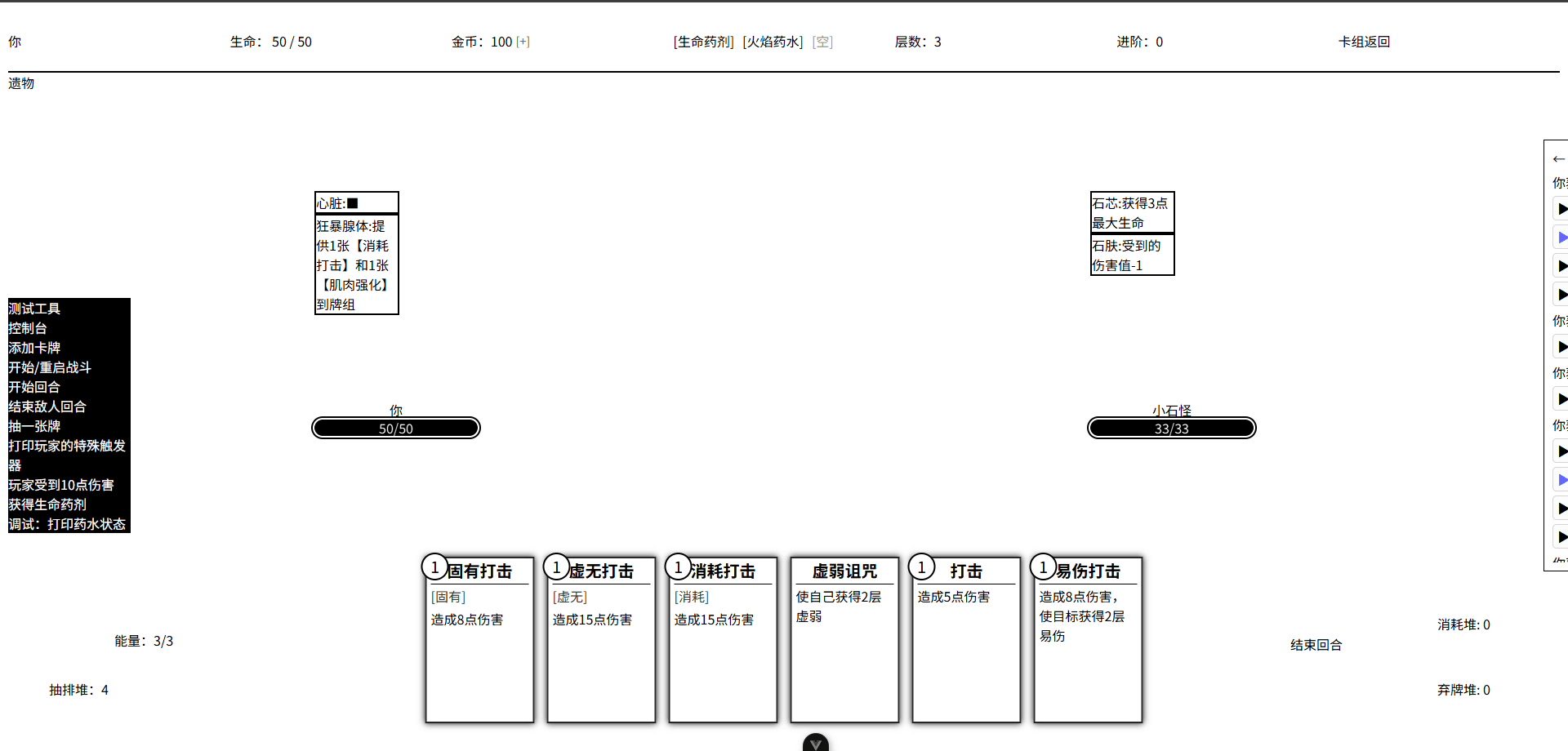 负面效果我目前实现的只有杀戮尖塔的原版的易伤和虚弱,我不太明白自己该复刻杀戮尖塔的所有效果还是按照我们实际游戏中的需求来制作效果|-` )