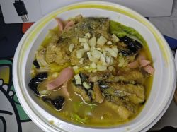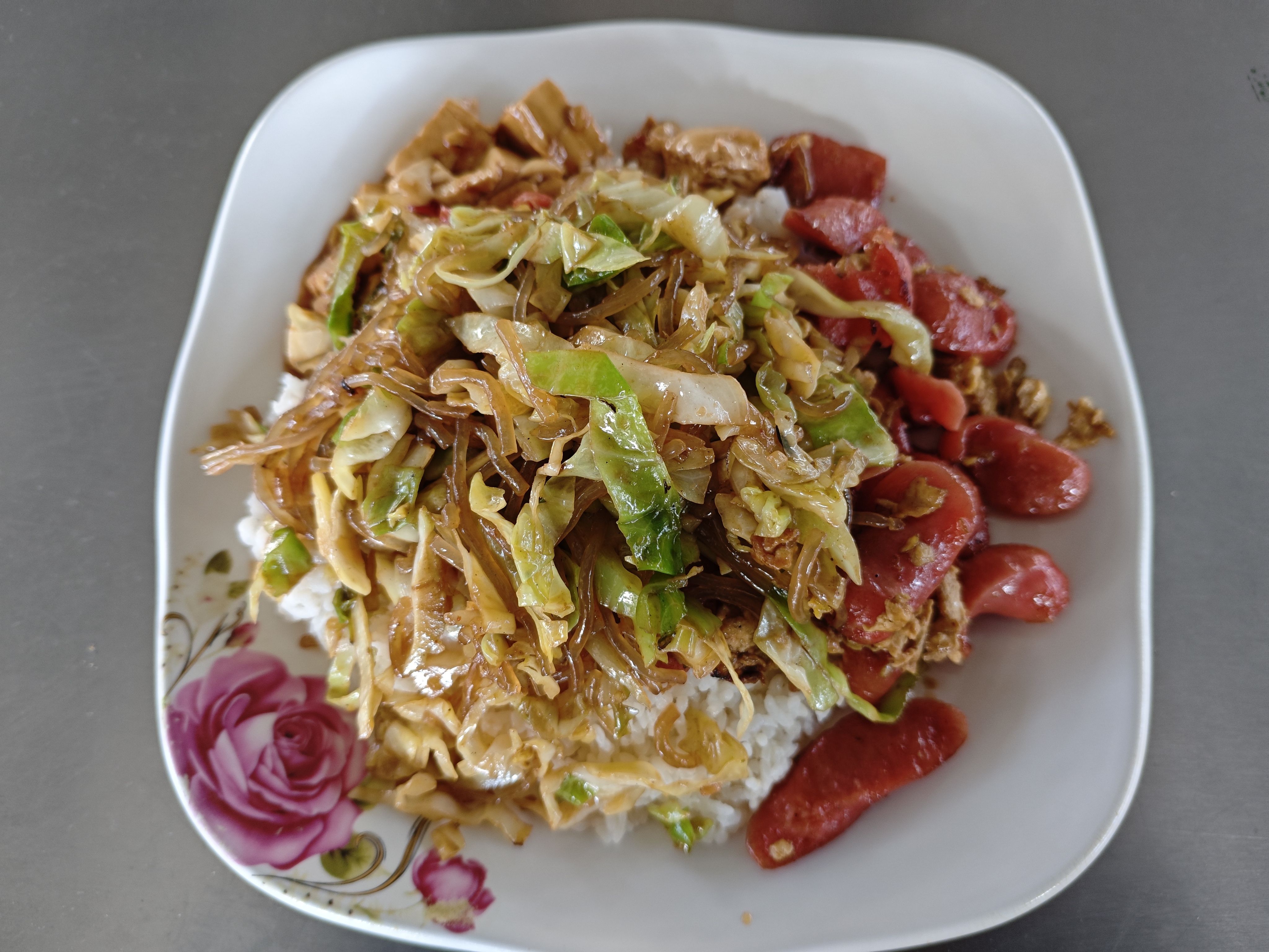 今天中午吃包菜粉丝,麻婆豆腐,火腿肠炒蛋,11块,肥哥们记得按时吃饭|∀゚