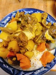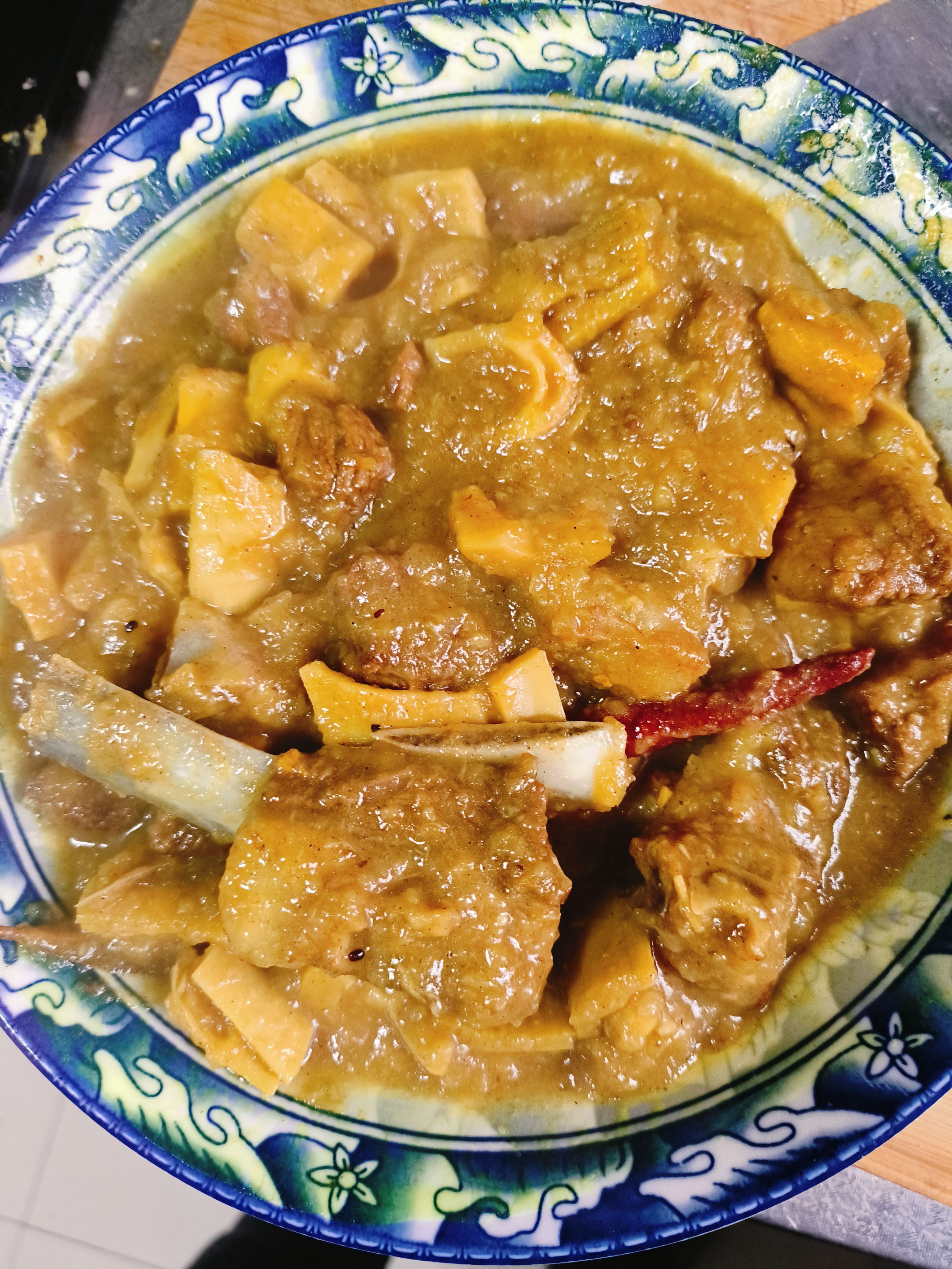 颜色正确!形态正确!干净又卫生喔~咖喱羊肉,里面的块状物是笋子。土豆已经完全糊化了。