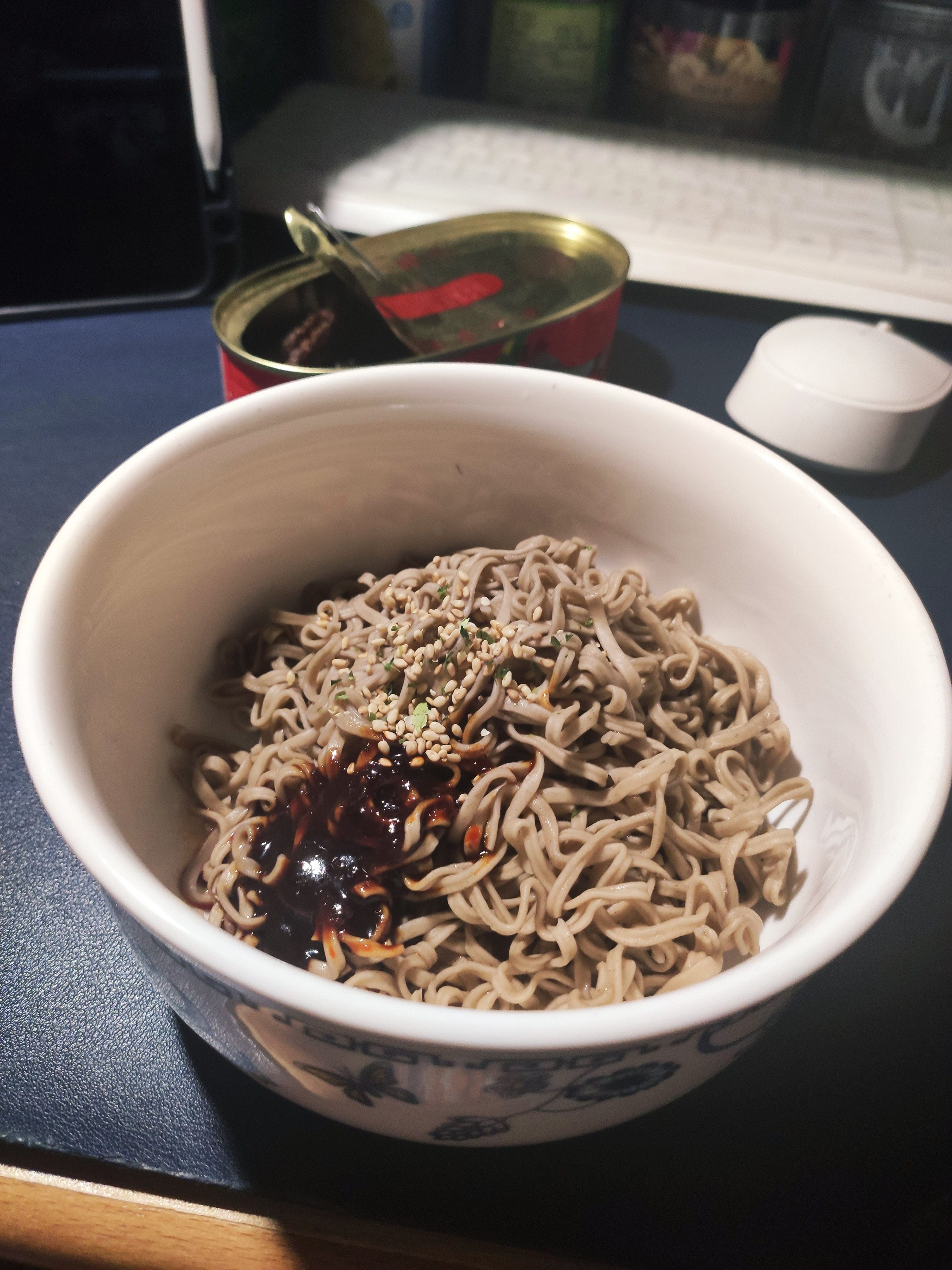 自买的速食冲泡荞麦面+自买的火鸡面料包+买买买版拼的鱼罐头( ゚∀。)