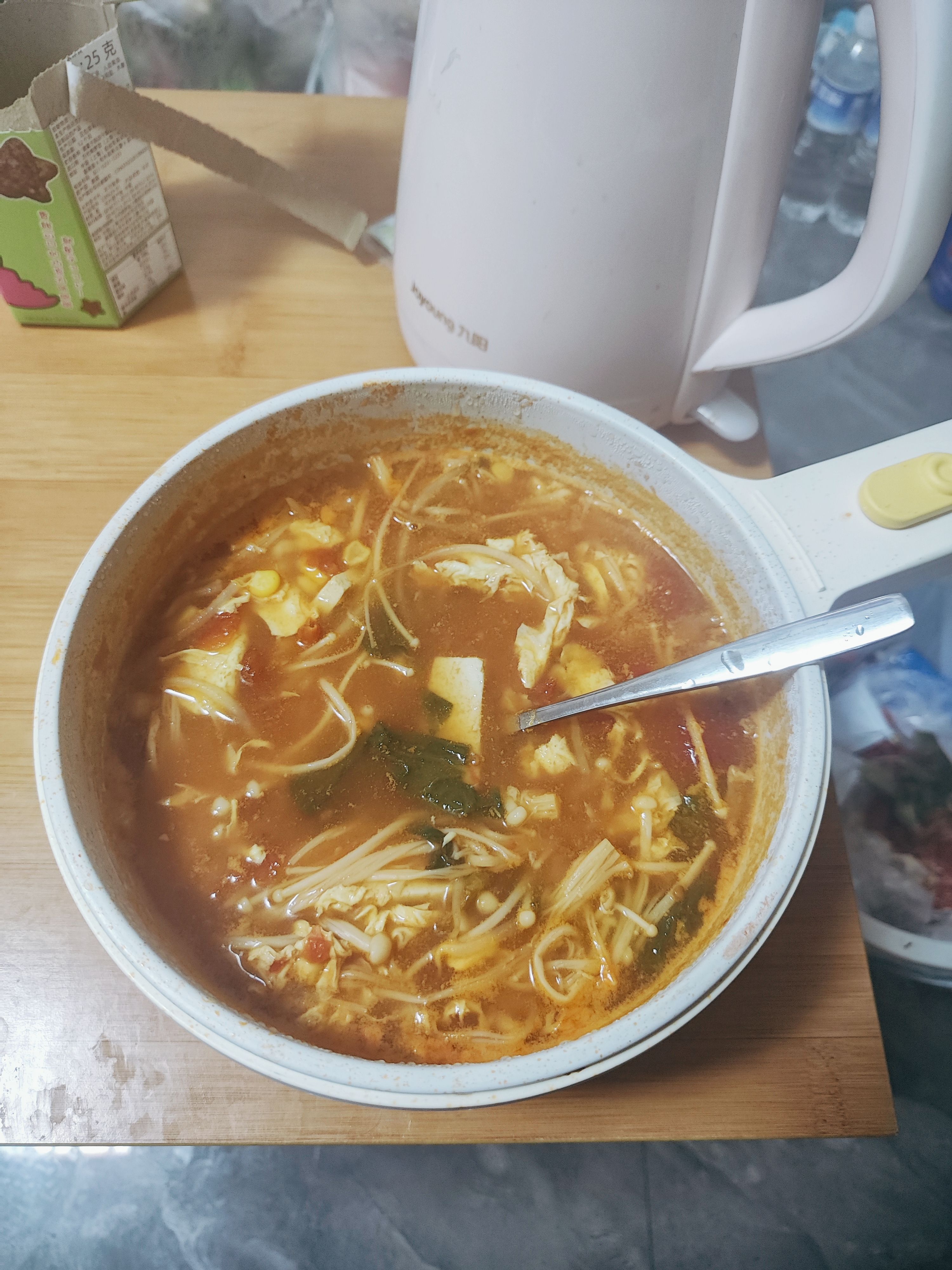 西红柿炒软之后加水,煮开之后放食材,调味只加一点生抽,真的好暖好喝