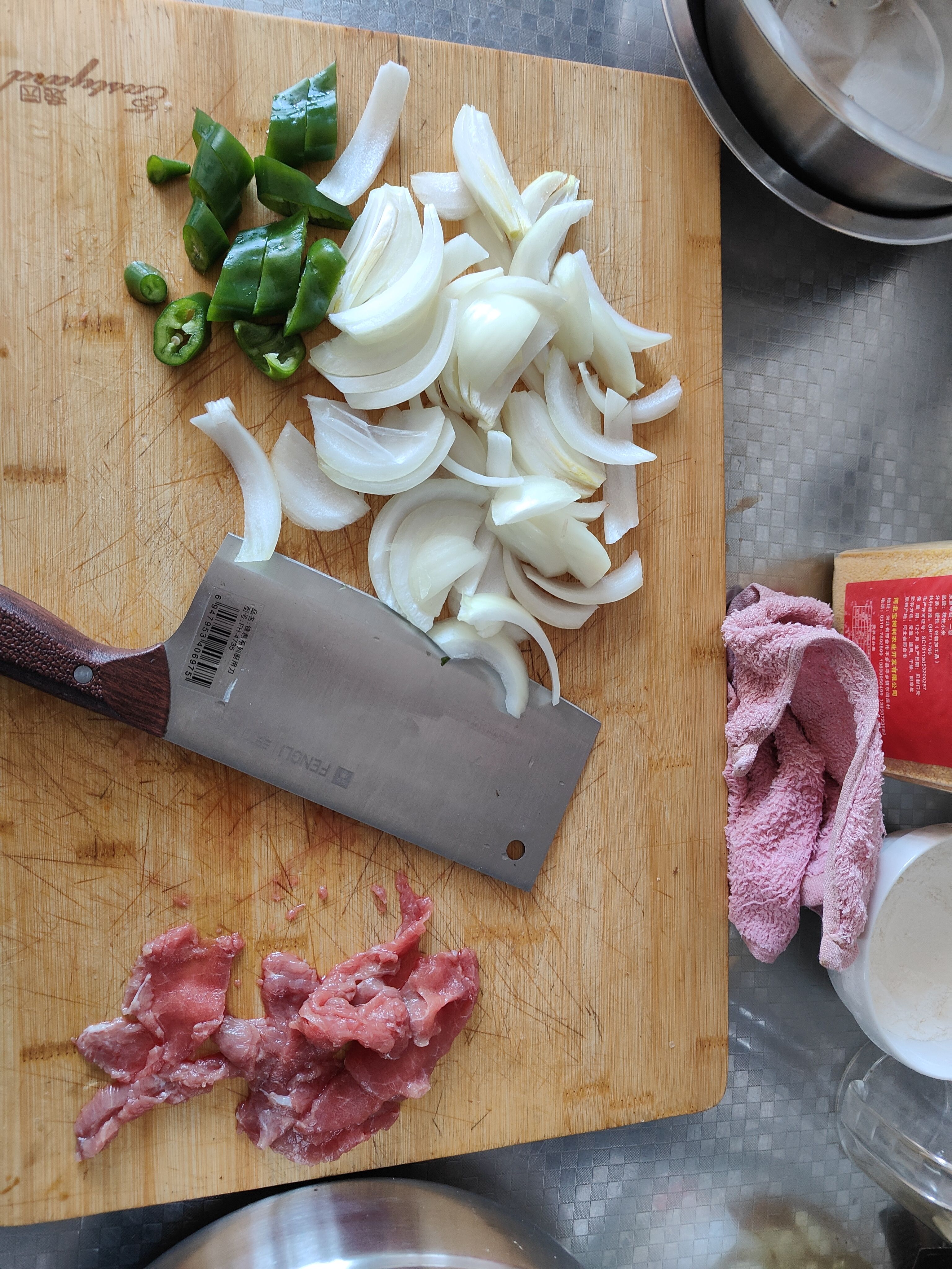 牛肉切薄片(切的不多,一块牛肉收了点皮外伤),圆葱切条,拿烧烤料的时候看见了辣椒,顺手拿了一个