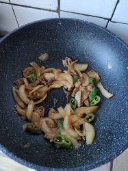 因为切的牛肉过于薄了,而且做饭比较随意,就先炒了圆葱和辣椒,后面加上牛肉,生抽,盐,胡椒粉,松鲜鲜,孜然,芝麻,辣椒面还有烧烤料