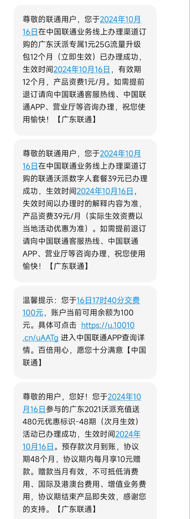 我看网页海报上写是可以在中国联通app上充就用了app渠道,然后收到了这俩短信,对照网页海报看应该是对的吧
