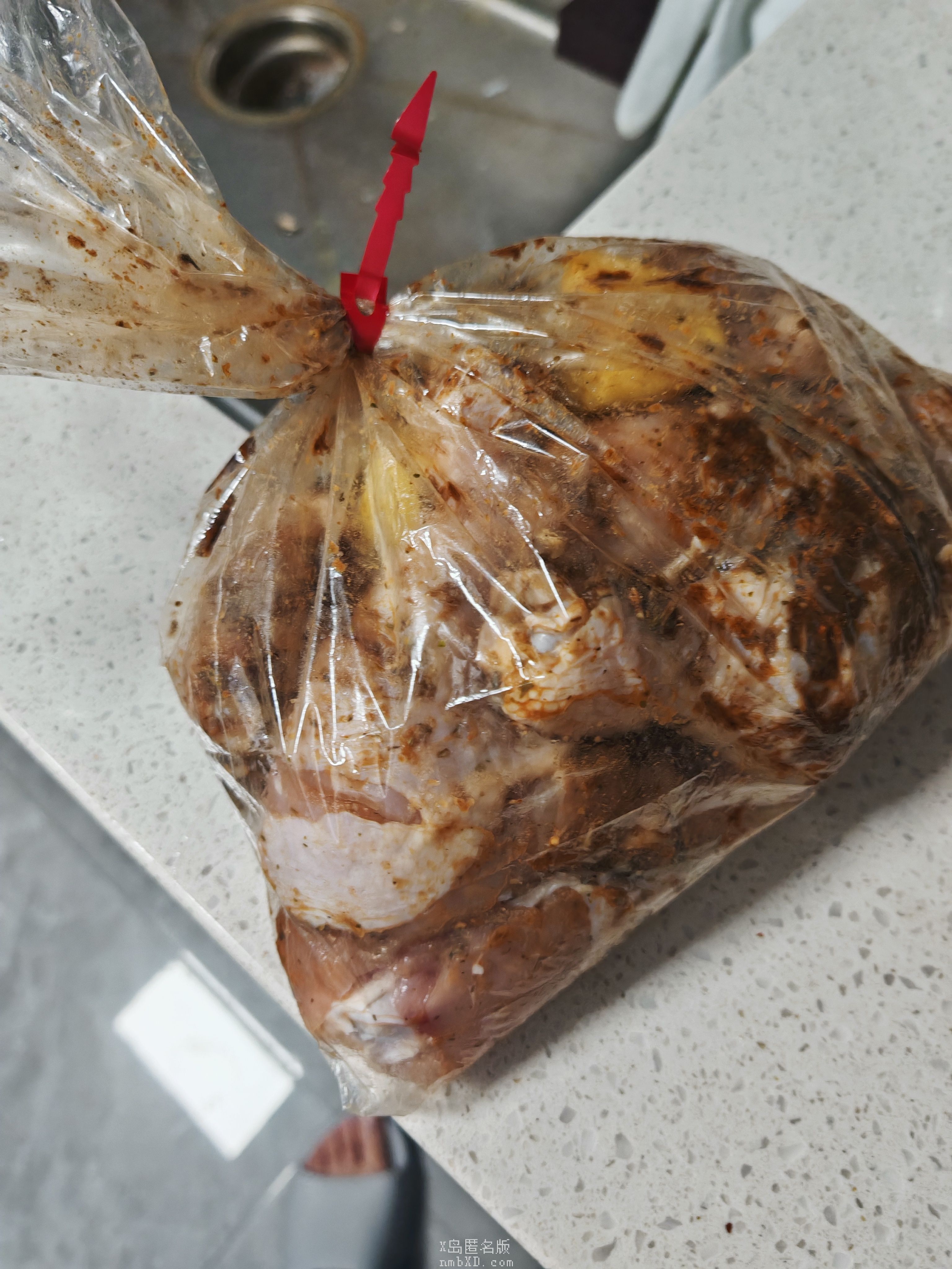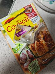 首先,这玩意怎么来的:15年在毛国待了一段时间,那时家里没有烤箱,但是学校宿舍有(公用的),就总想烤点什么,这就是在附近超市发现的方便产品:这个袋子上半部分打开,里边是一个特制的塑料袋,倒过来从底下撕开,可以倒出来烤肉用的料,把料和肉一起装在上边那个袋子里,封好口就可以烤了