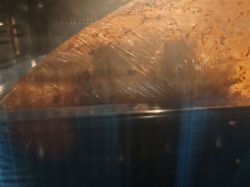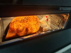 在烤箱里,这是已经烤了半个小时了,能看到左下角有些鸡腿出的水在沸腾,袋子鼓起来了