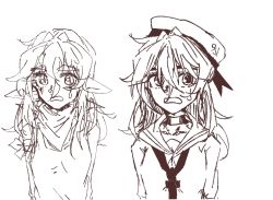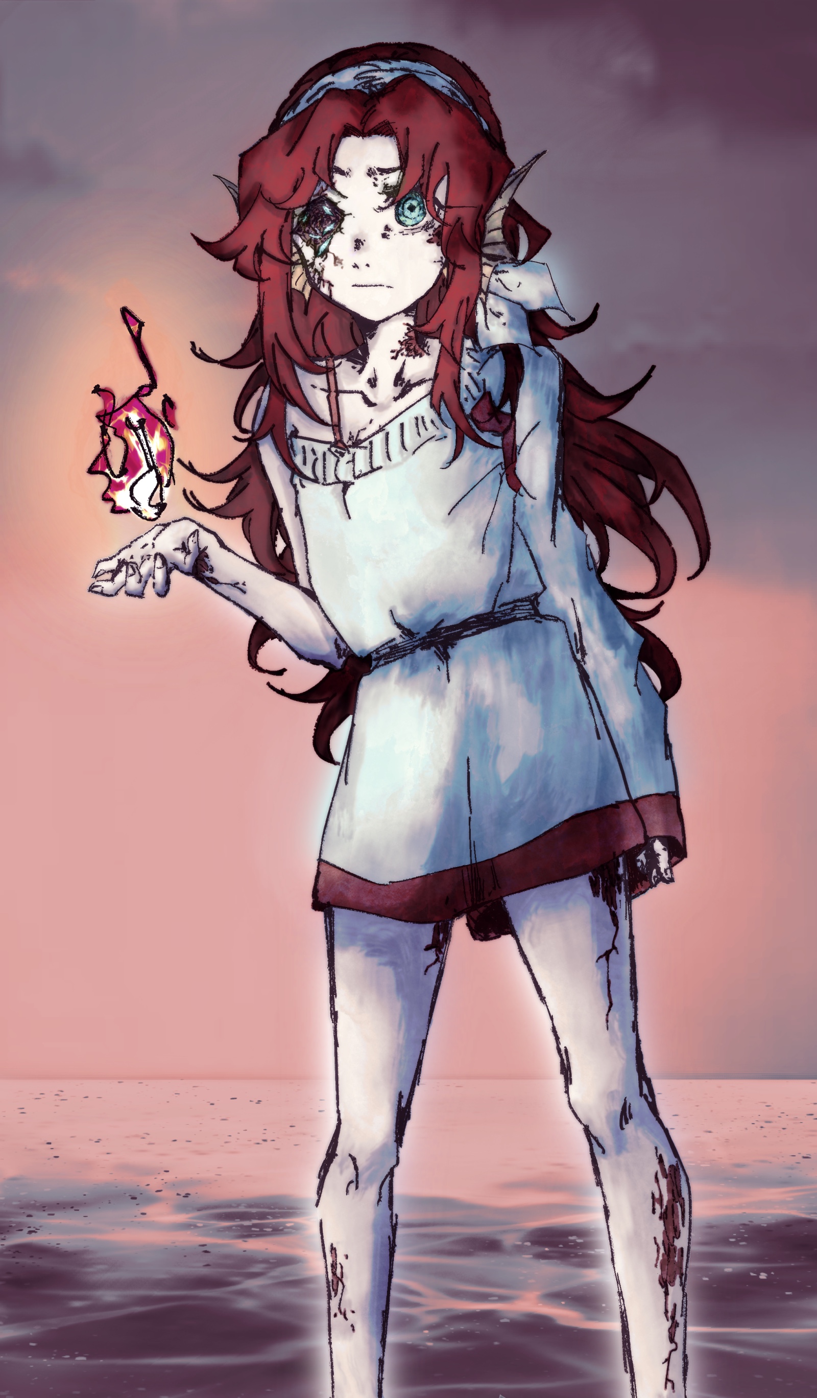 红发,瞳色为湖蓝,肤色为略灰的冷白皮,因为身体很脆所以身上有一些不小心磕碰造成的裂痕,右眼被小和打裂了,幼年款的衣服是从岸上抢劫来的大裤衩改装而成的裙子,一个裤管套躯干上一个裤管当袖子,还有一个胳膊无袖( ゚∀。)