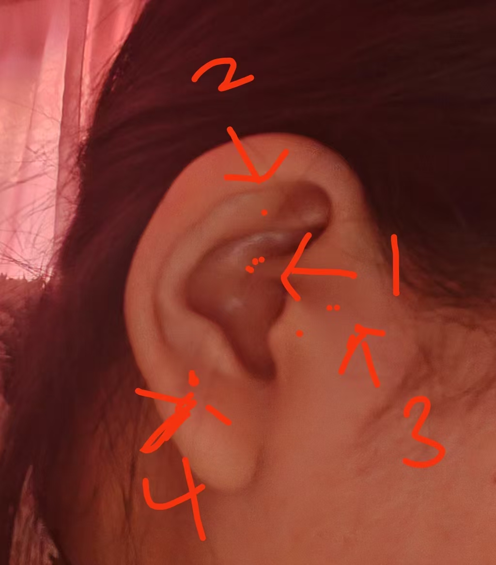 紧急插播一条通知,在考试之前容易拉肚子和吐的同学可以买一盒王不留行耳穴贴,在右耳朵(左边也行)上按照这个位置贴,效果特别好・゚( ゚∀。) ゚。