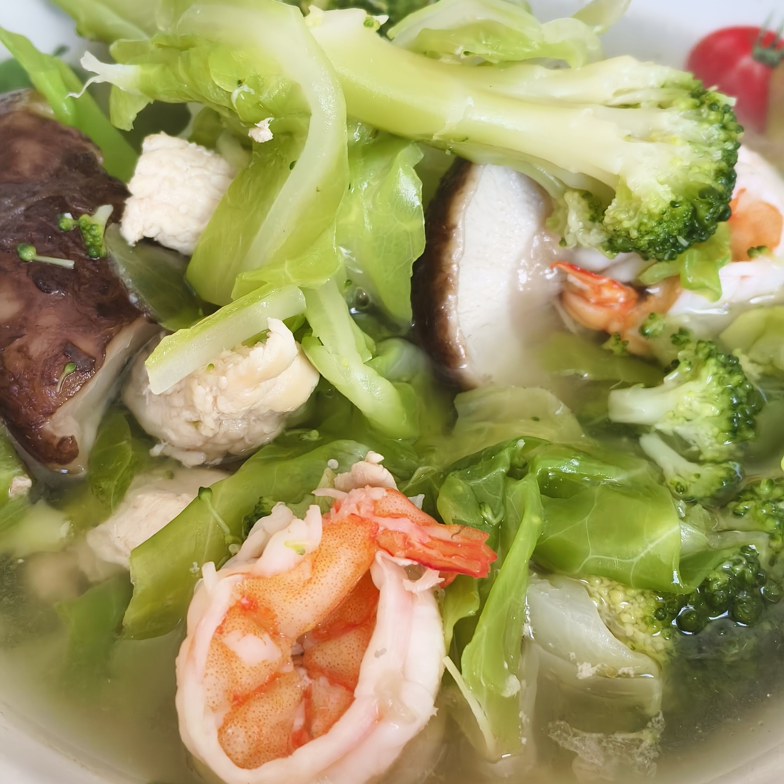 后面如果有条件的话可以自己炖蔬菜汤吃,我特别爱吃这个,放了包菜,西兰花,香菇,鸡肉,虾仁,调味只放糖、盐还有姜,吃起来很鲜甜也很满足……(>д<)