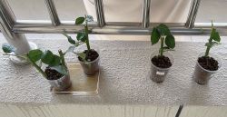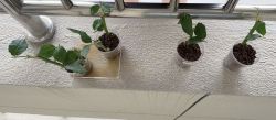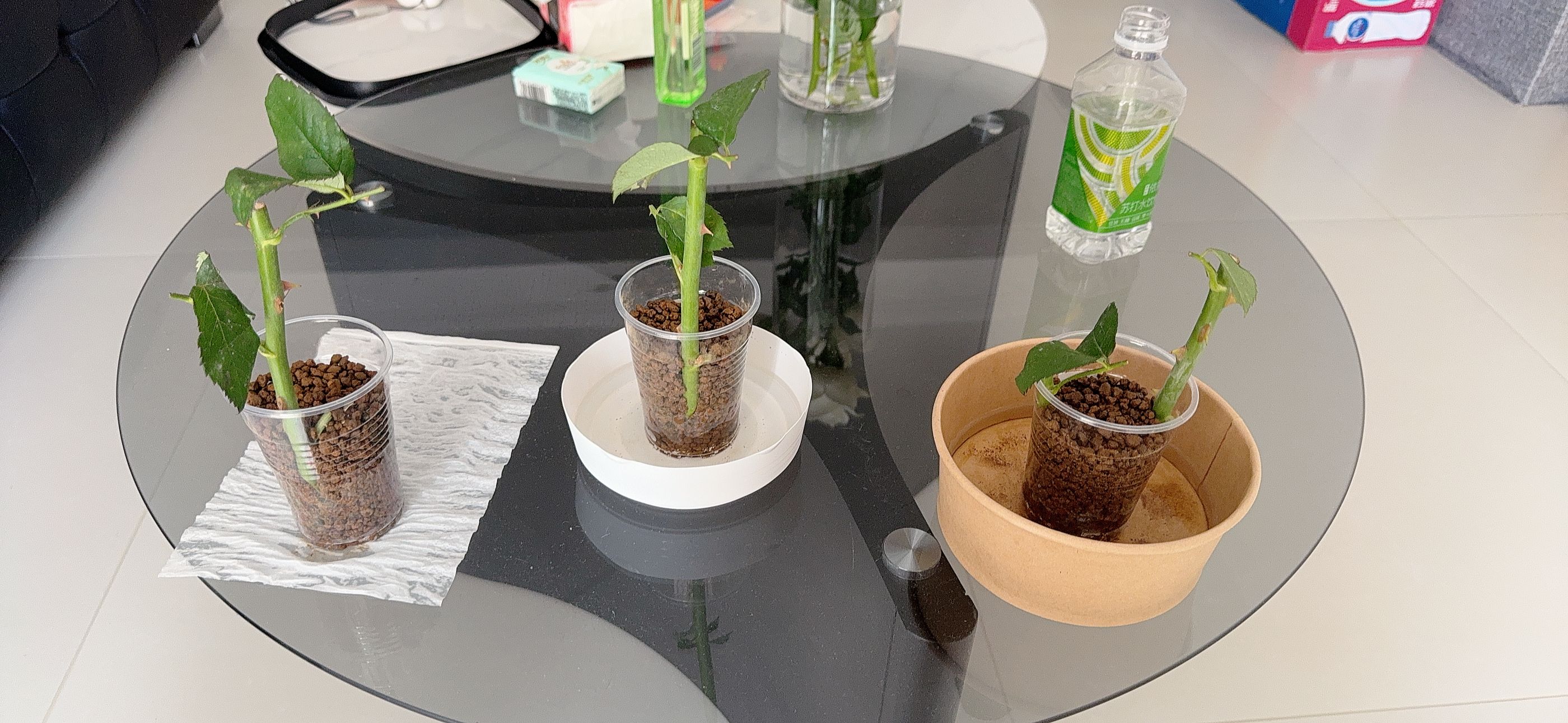 这三杯是放在家里的,两杯有托盘浸水一杯没有托盘。有托盘的两杯一杯是多菌灵直接扦插,一杯是过水扦插的,没有托盘的那支是多菌灵直接扦插的。po本来应该再放一杯过水扦插无托盘的在这里,但po的土用完了,暂时先分这几组。