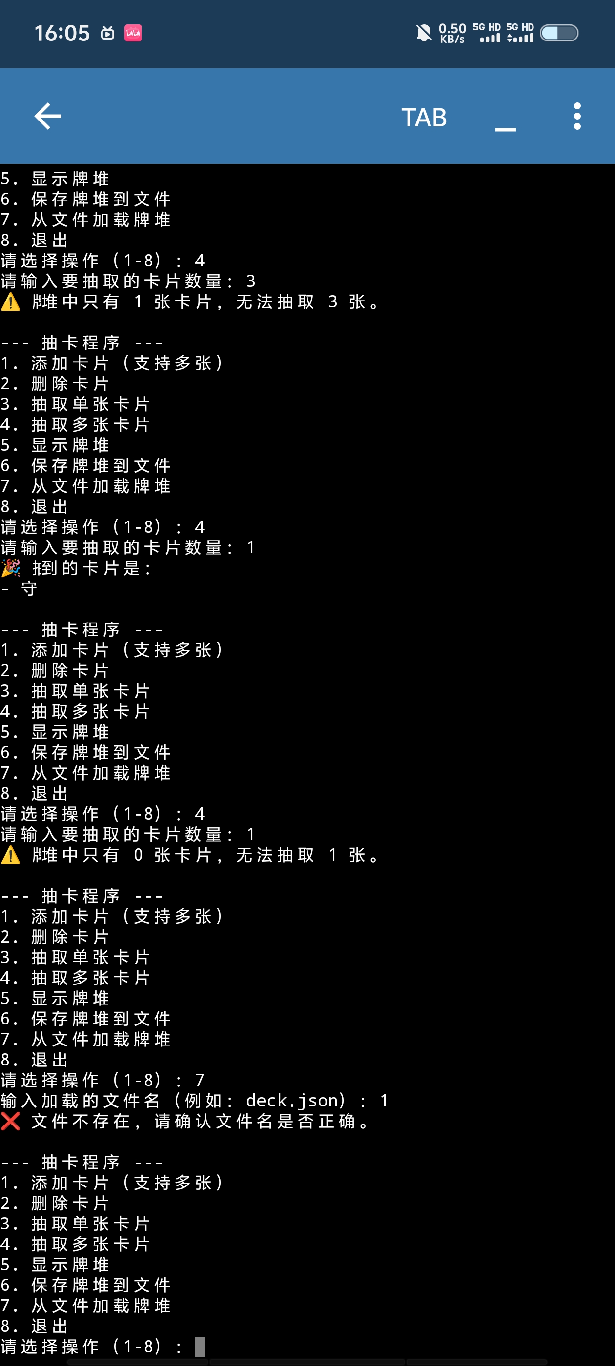 ( ゚∀。)7.这个是你自己输入完所有卡组之后要保存的文件名,输入六,然后输入一个文件名进行保存,保存之后这套有你全部卡组的就是原始卡组,之后每次打开或者牌用完了,输入七重新输入文件名进行加载