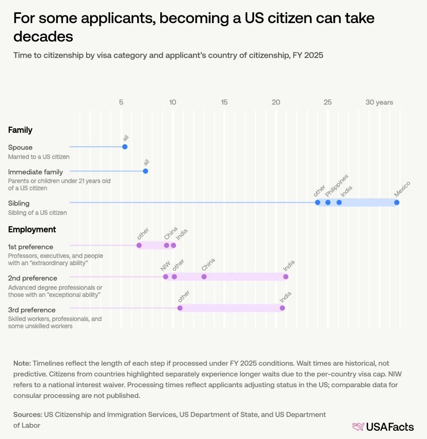 菲律宾、印度和墨西哥人的兄弟姐妹需要最长的时间申请成为美国公民