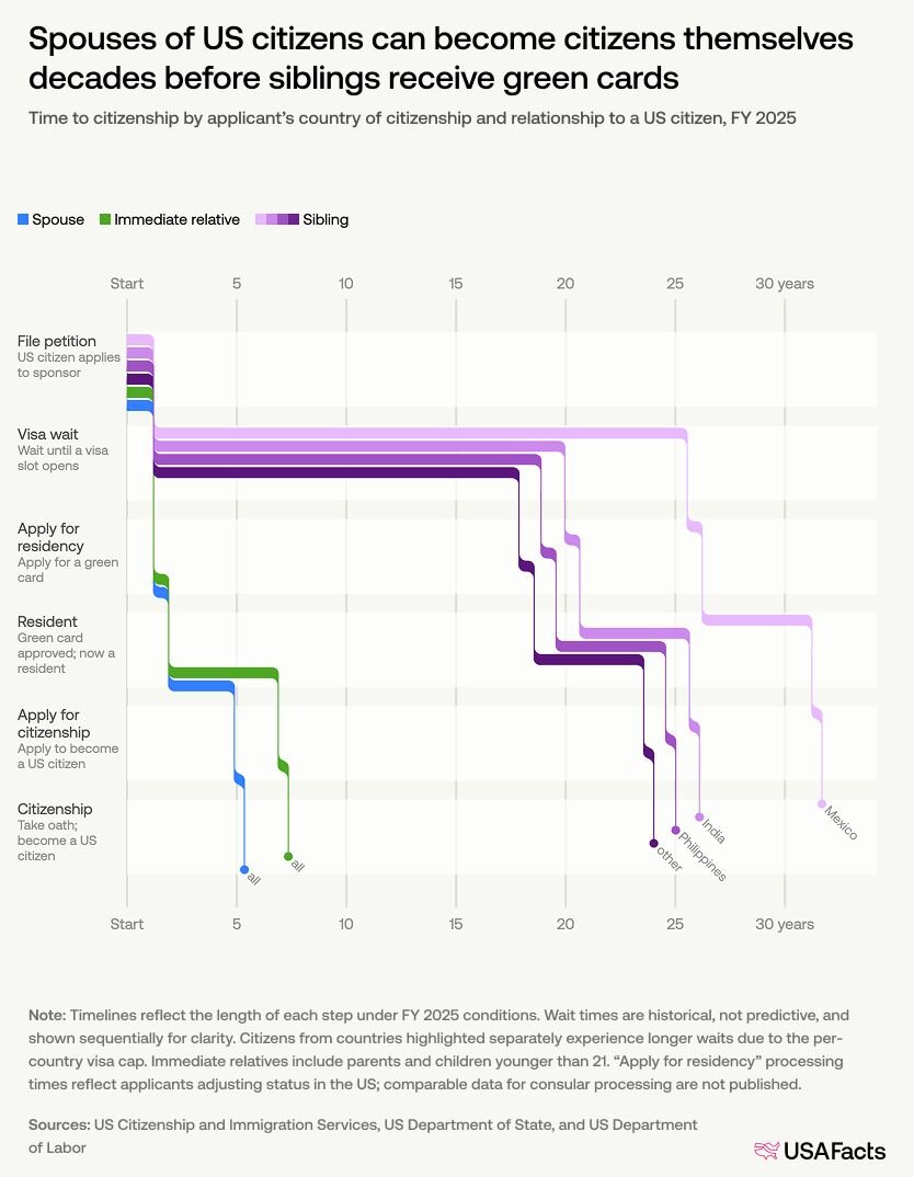 其他家庭成员则面临排队。美国对大家庭使用优先系统,上限可能将等待时间延长至数十年: