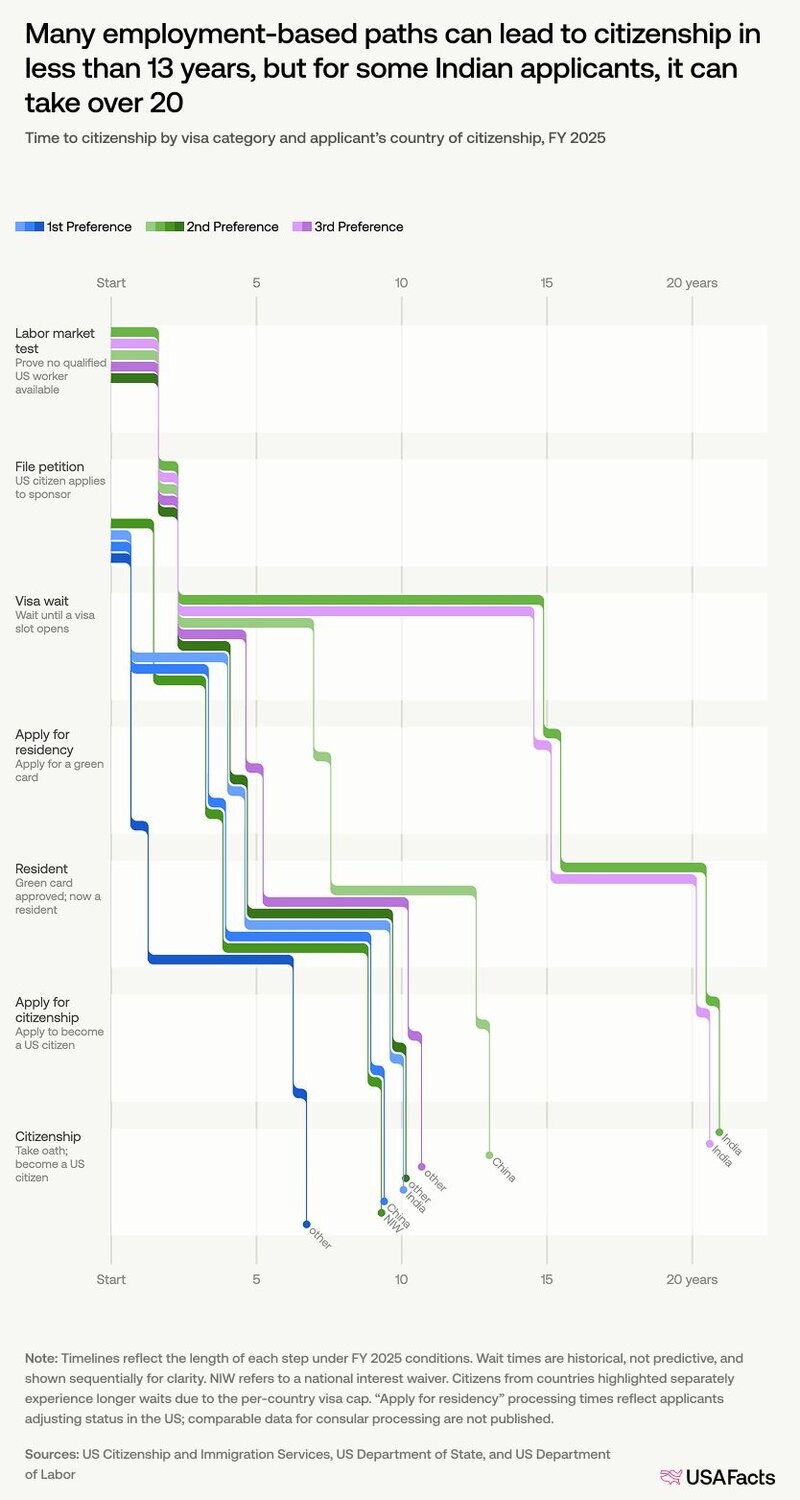 许多基于就业的路径可以在不到13年内获得公民身份,但对于一些印度申请者来说,可能需要超过20年