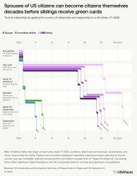 最后的类别可能花费最长时间。2001年(乔治·W·布什进入白宫之年)申请的美国公民的墨西哥兄弟姐妹从2025年9月开始有资格申请绿卡。