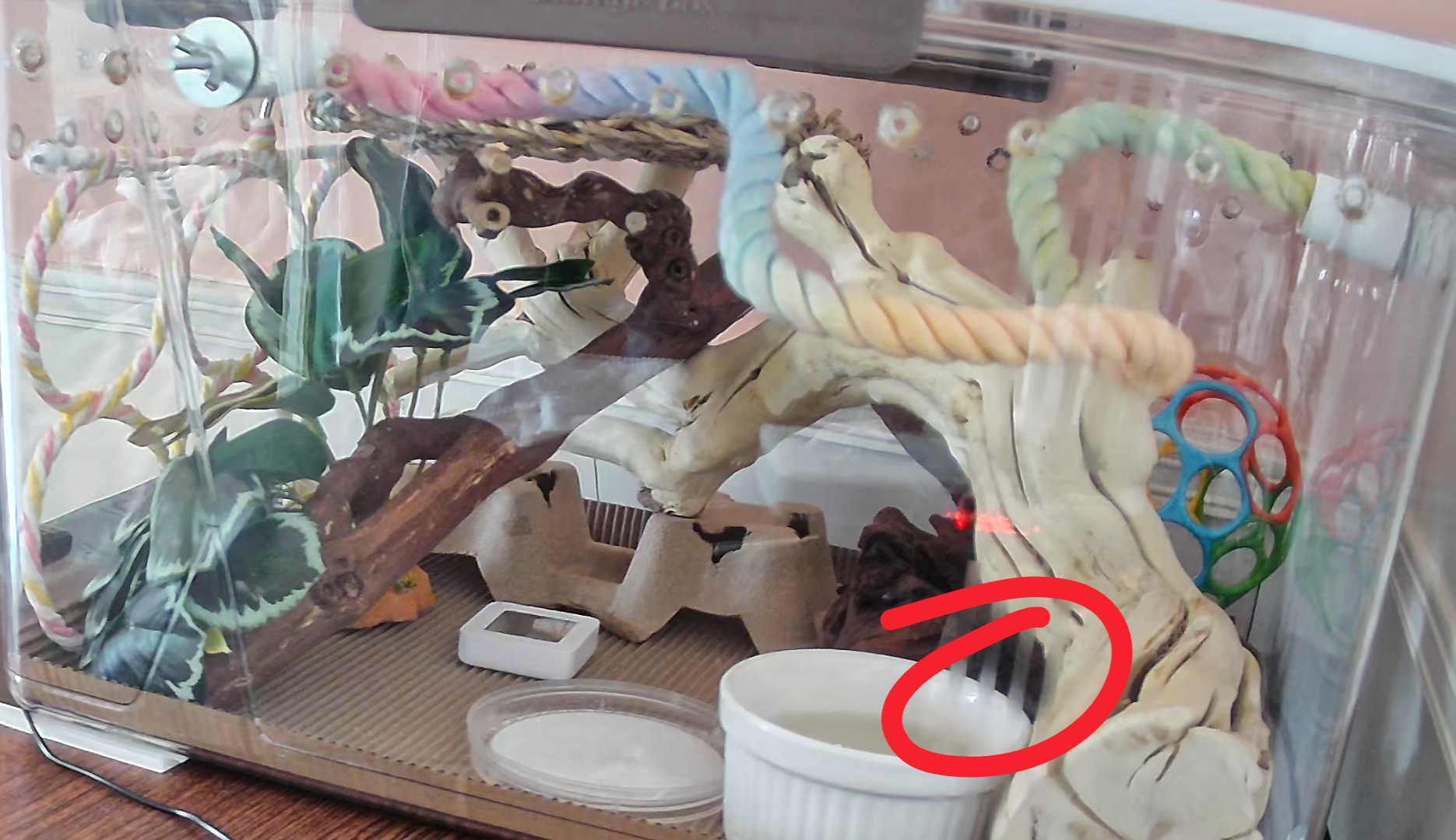 她昨晚在绿植那里盘了一晚上,今早又爬回浮木下面了