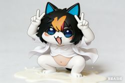 人物呈蹲姿,微张腿,露出腹部,双手在头部两侧比出“V”字手势,姿态较为活泼且具有张力。嘴巴张开,吐舌头的表情,增添了俏皮、可爱的风格,与整体的风格有反差感,保持原画风,背景不变,地面为牛奶材质,人物衣服飞舞,显得较为灵动有趣。采用平视视角,镜头与 人物处于同一水平高度,能够让观众与人物之间产生一种平等的视觉交流感,使人物形象更加亲近、真实。采用中心构图,人物位于画面正中央,这种构图方式可以将观众的注意力高度集中在 人物身上,突出主体。(*゚∀゚*)