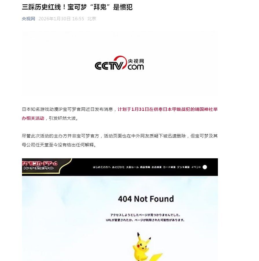 得嘞,今天早上环球日报这几家媒体的稿子一上热搜,舆论基本是把责任主体引到整个宝可梦和任系(PTCG+GF+任天堂)上了,而且新闻里的表述也是向“有意越线”引导的(缺乏审核、事发后跨国协调迅速删除→疑似有意审核通过、舆论逼迫删除)( ゚∀。)看之后舆论发展方向和相关方的反应了,起码我觉得这事上PTCG之外的公司部门罪不至死,封杀任天堂更是无稽之谈了
