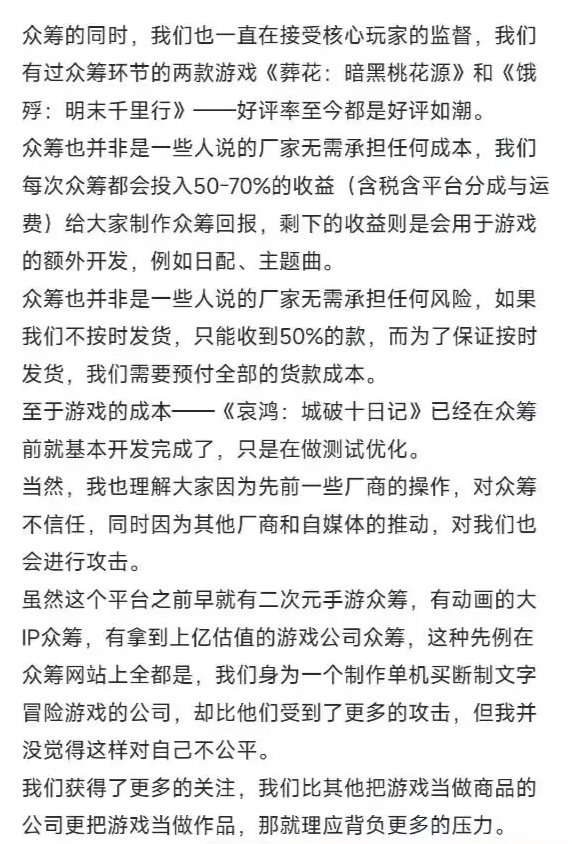 再补一嘴吧,可能不对,但我看到的部分里,众筹收益并不是完全用来做游戏的,这里就说捐了一半,结合引用的这段截图里的5-70收益做回报,其他是额外开发以及破城早就基本开发完成来看,不管是明末还是破城,都不是需要依靠众筹来支撑主要开发,而是用来额外盈利的