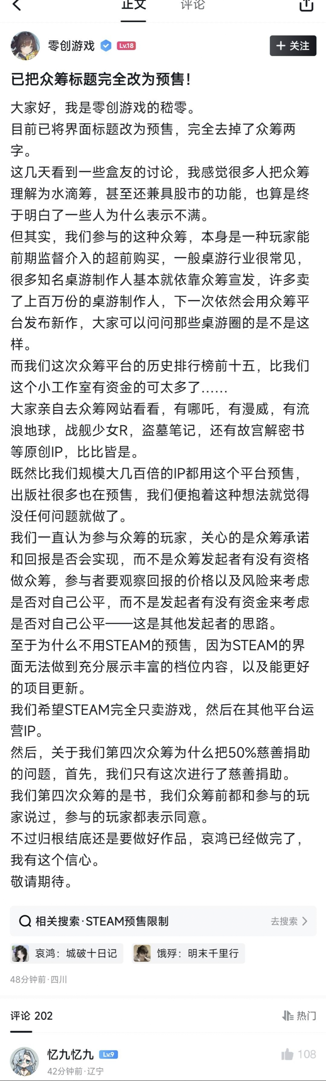 但最后还是修改了,并列举了各个大ip的众筹情况,可言语里还是有股“为什么我就不能这样搞”的不服感