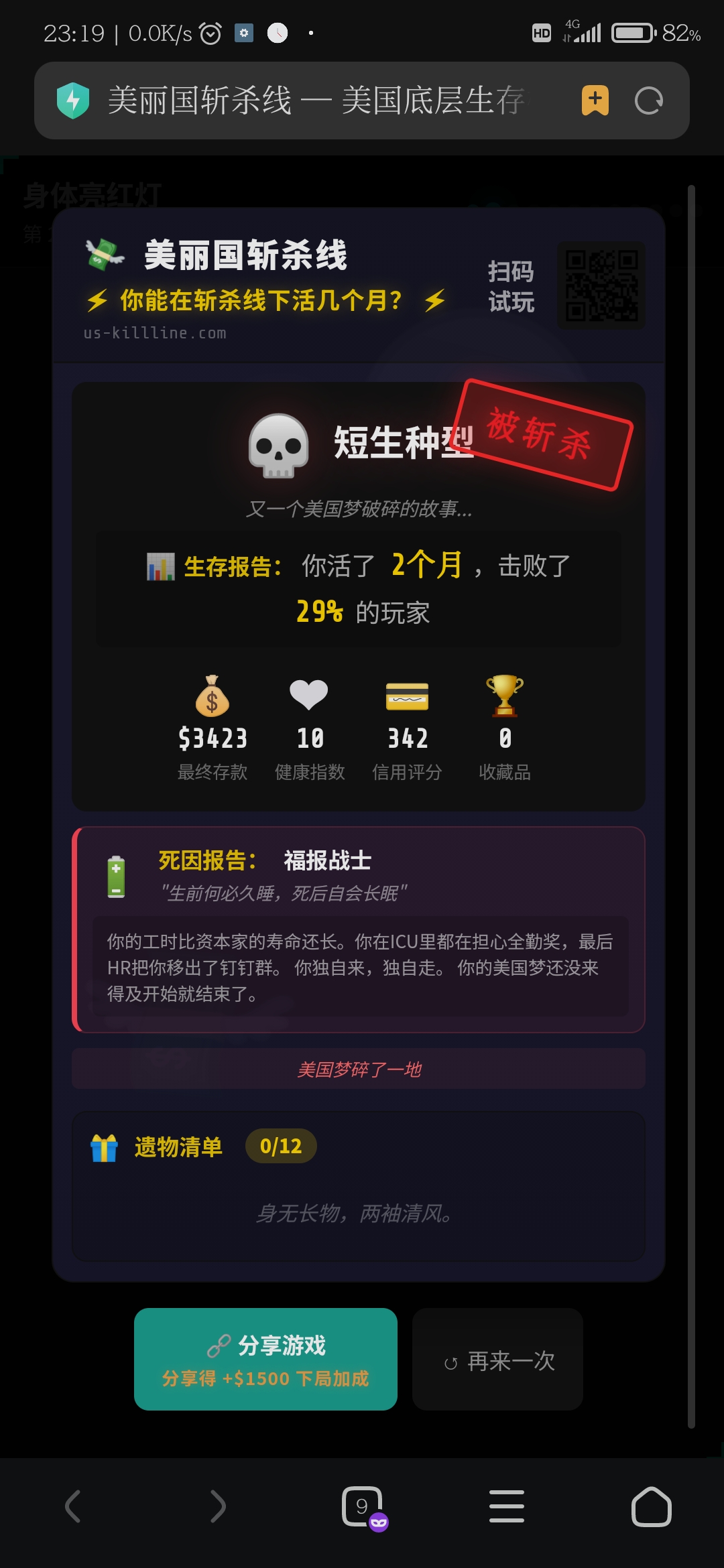 攻略:第一个月必须借高利贷,因为第一个月账单事件必然发生没钱除了选扣信用分最多钱最少的那项以外其他直接gg。