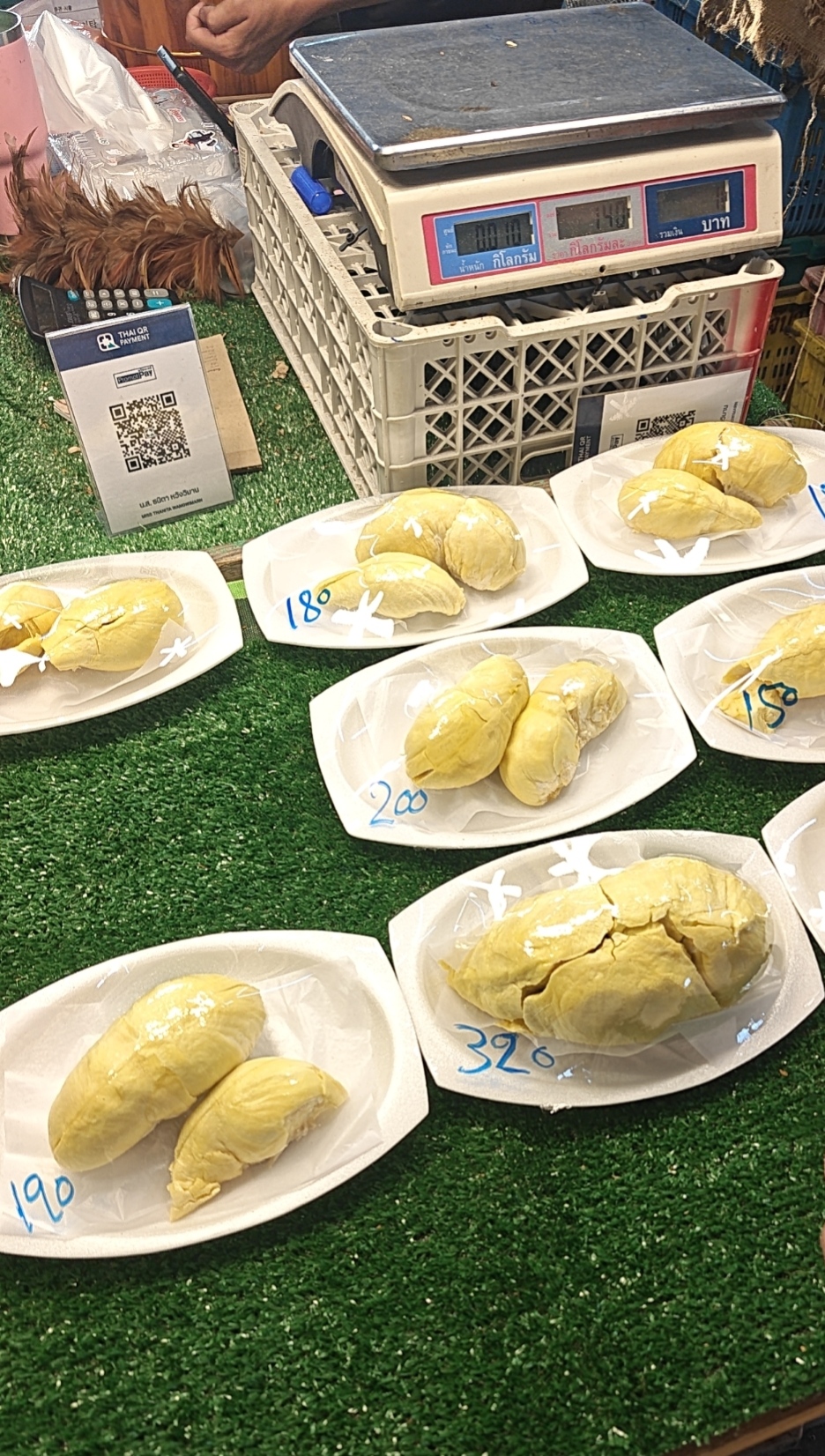 已经包装好的水果会直接在包装膜上写上价格,社恐福音。并且摊贩只会卖熟的给客人,太生的榴莲对方会摆摆手推荐另一份给你( ゚∀゚)