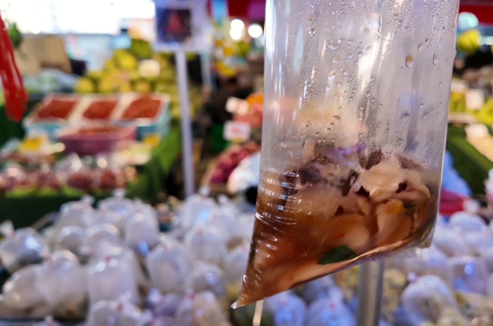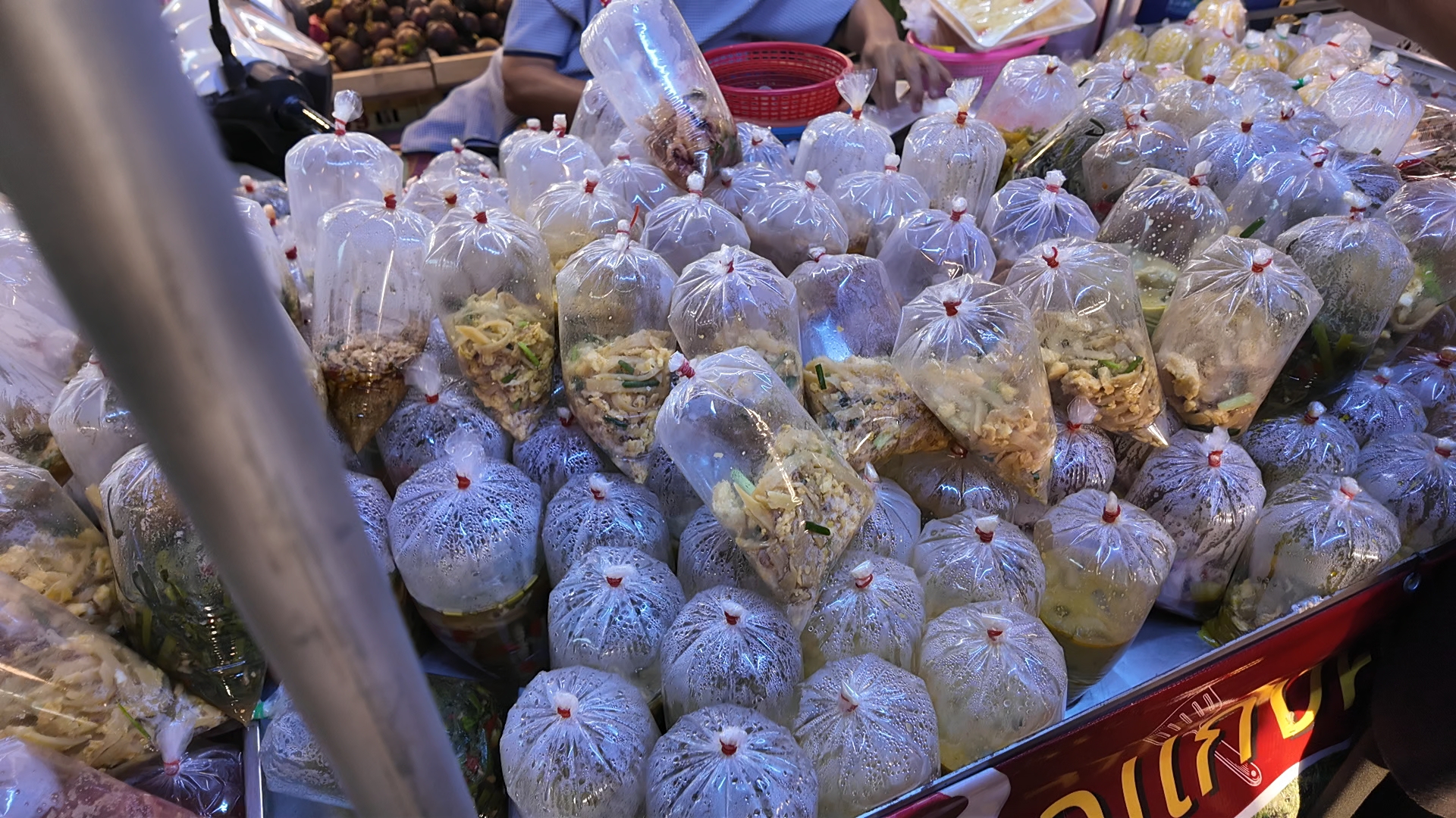 吃完榴莲还刚好碰上一个老奶奶的推车移动小摊。各种菜一份一份的都包装好装在车里,不仅有炒海鲜炒青菜炒面之类的,还有包装好一袋袋的汤和看起来像粥的食物,种类超多( ゚д゚)