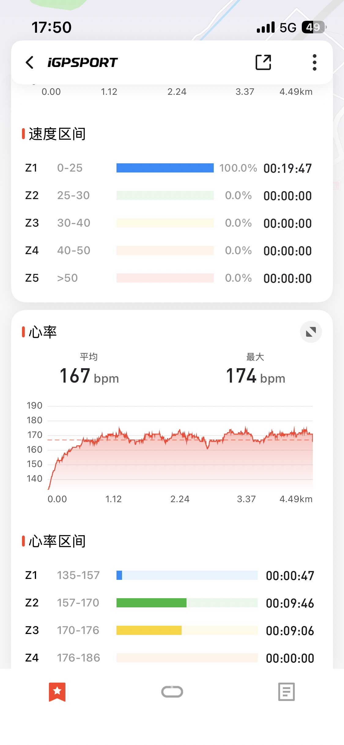 不知道是不是码表的问题,第二次爬的时候明明心率也是一直在170-175直接,但他给我显示二区到三区。怎么回事呢?但目标反正是控制在150左右的心率吧(´・ω・`)