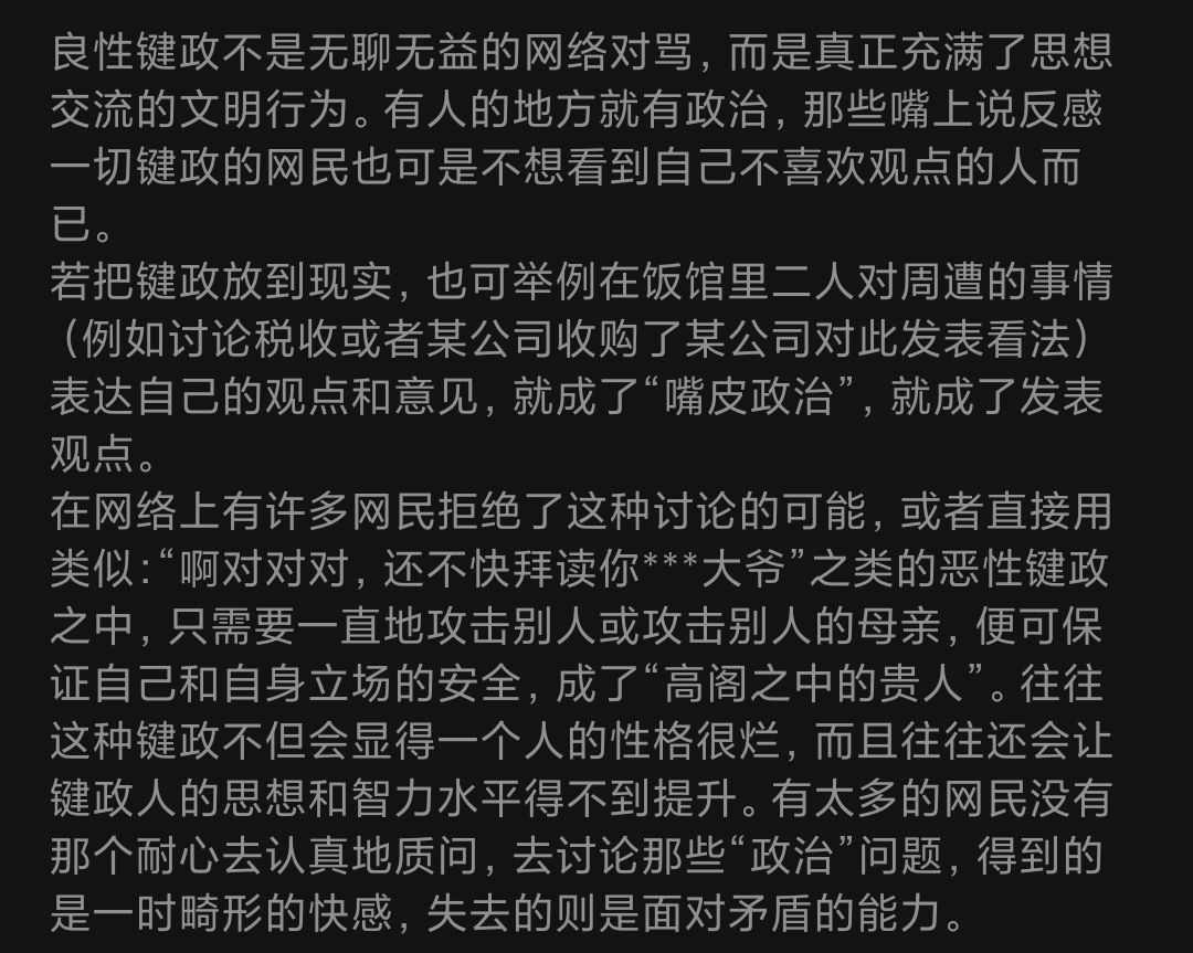所以,面对有人发表键政言论,请切莫参与——让他一个人手冲去吧,你要是掺和一脚,键政就不再是他的孤独手淫,而是你们俩大汗淋漓,香艳动人,在所有人面前丢人的赛博性爱。