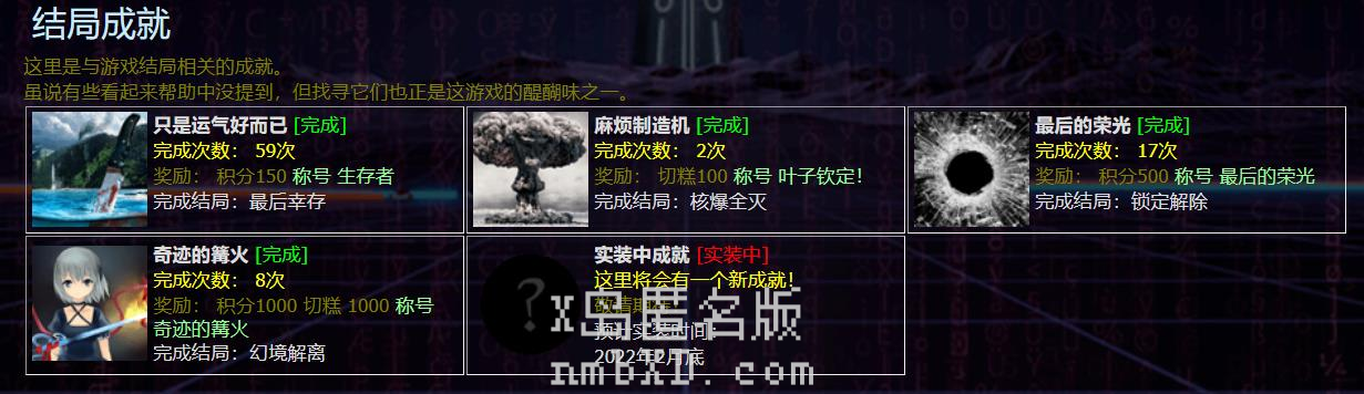 该成就需要完成“核爆全灭”结局。“核爆全灭”需要获得“奇怪的按钮”后使用,有30%的概率触发该结局,30%的概率死亡,40%的概率无事发生。而“奇怪的按钮”在游戏2禁和3禁时会各随机刷新一个,而在4禁时,会在三体星刷新一个。除了2、3禁随缘摸到以外,理论上只要开一个小号,把时间拖到4禁,然后把三体星搬空,就可以稳定获得“奇怪的按钮”,之后拼脸赌核爆结局即可。