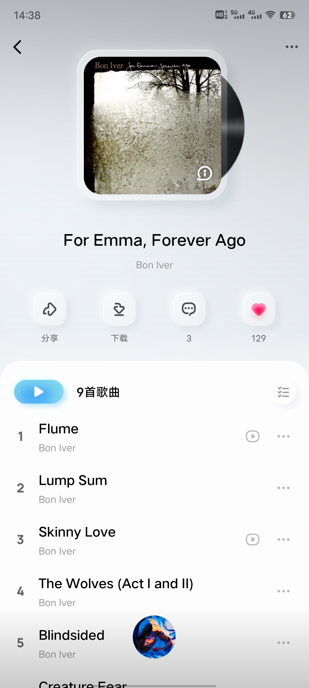 Bon Lver 一整专献给自己的亡妻 喜欢民谣的很建议听一听 充满感染力的木吉他情绪很饱满听完想哭一哭力