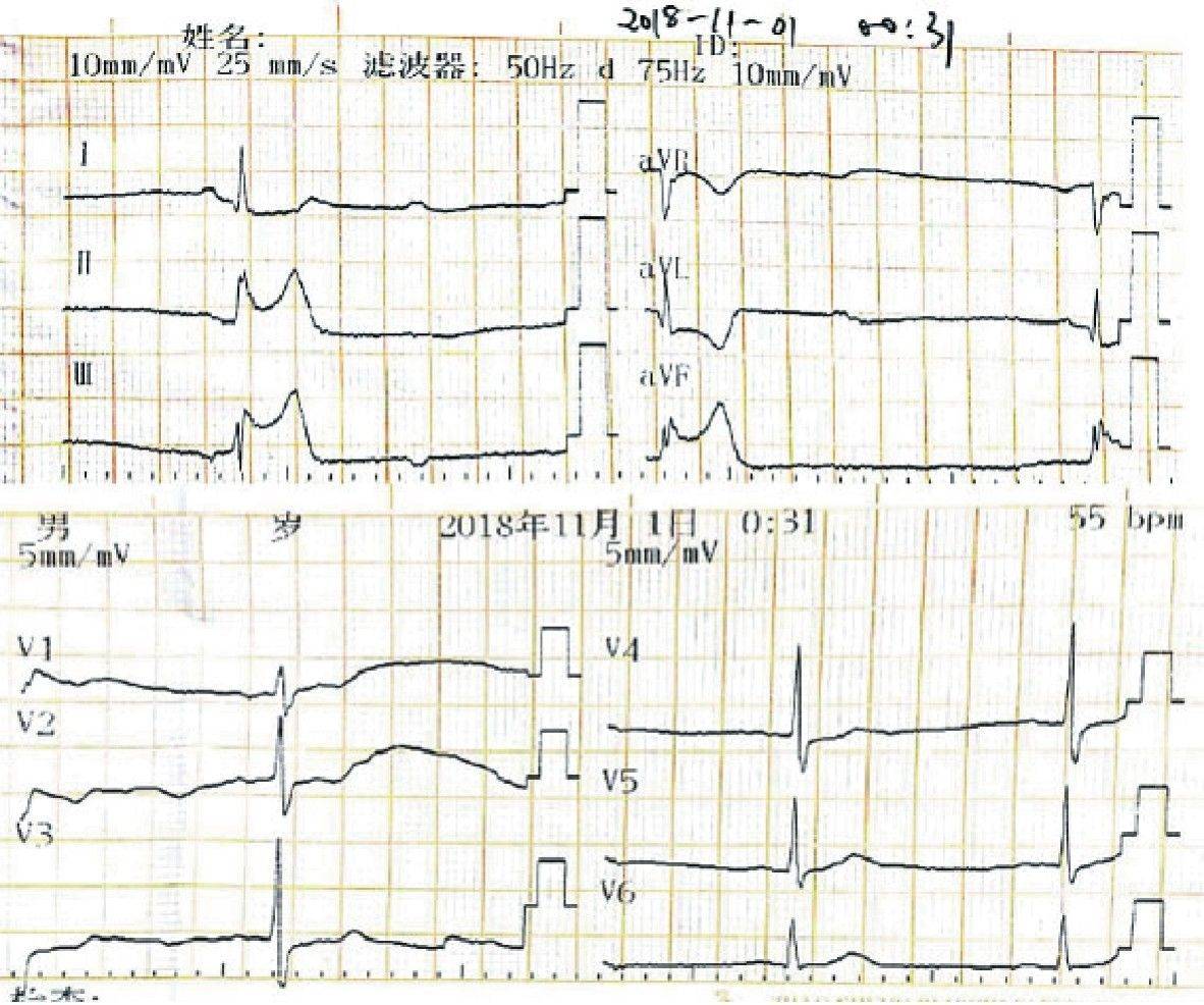心电图:示二、三度房室传导阻滞,Ⅱ、Ⅲ、aVF、Ⅴ5、Ⅴ6 ST段抬高,Ⅰ、aVL、Ⅴ1~Ⅴ3导联ST段压低