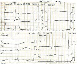 2018年11月6日凌晨患者胸痛再次发作,烦躁不安,多次上腹部疼痛,持续5分钟左右;血压85/50mmHg,心率102次/分;