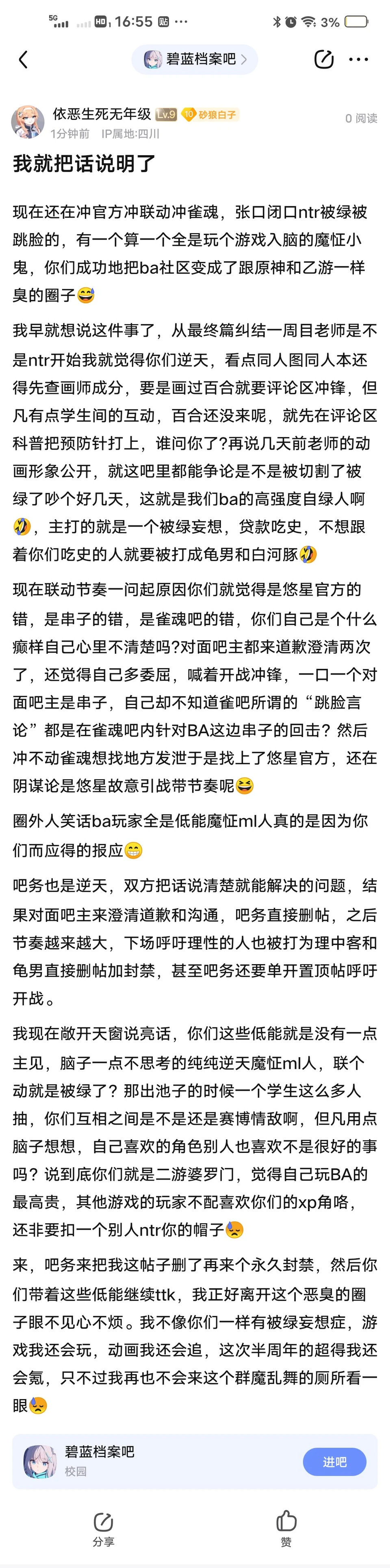 碧蓝档案吧的逆天说自己贴吧是国内ba二创产出大头,受这次事件影响,二创产量也将减少,对国内ba社区打击是极大的