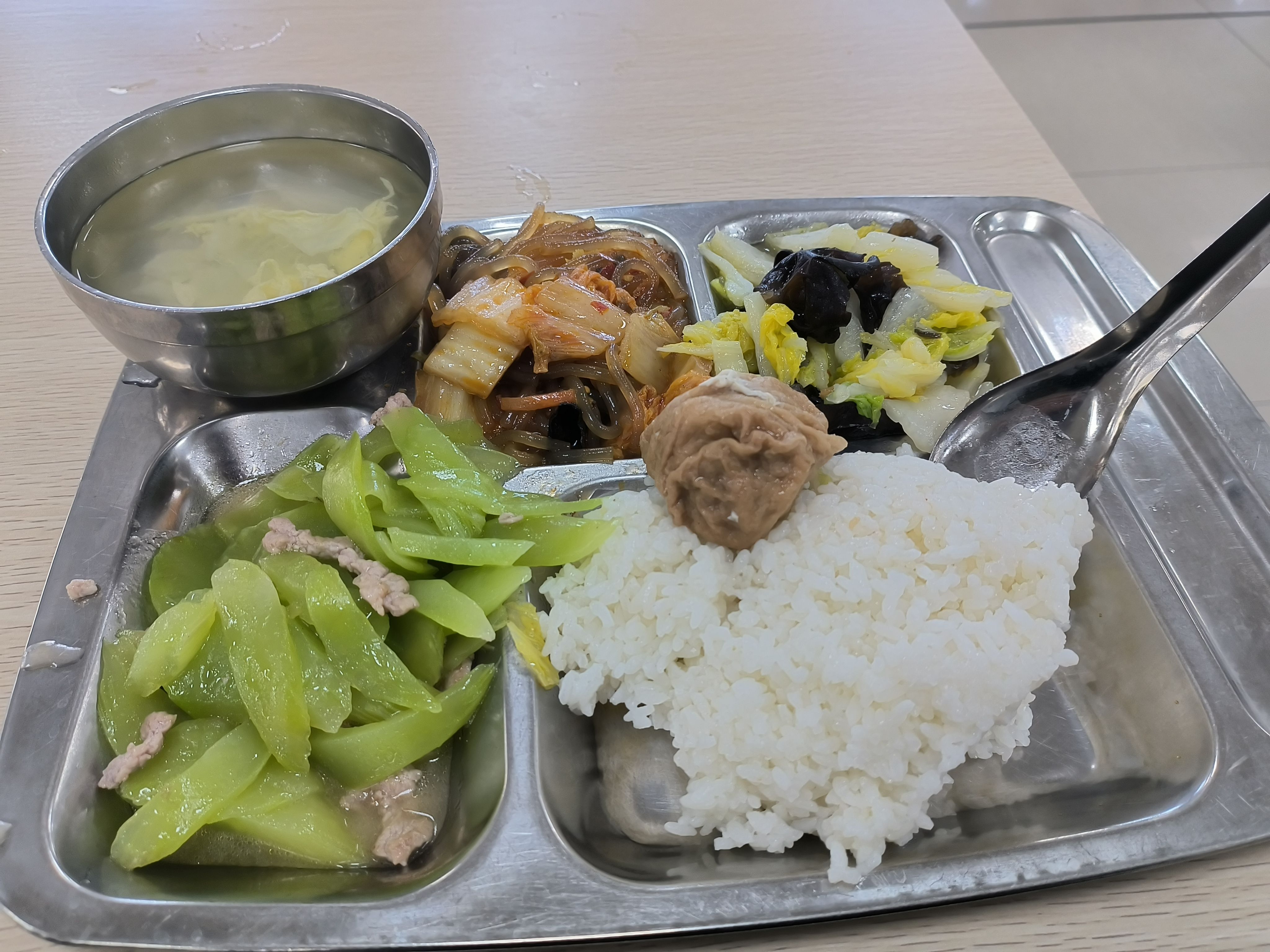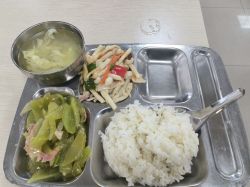酸辣粉丝、莴苣炒肉、白菜木耳、豆皮肉丸、白菜蛋汤