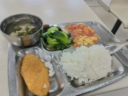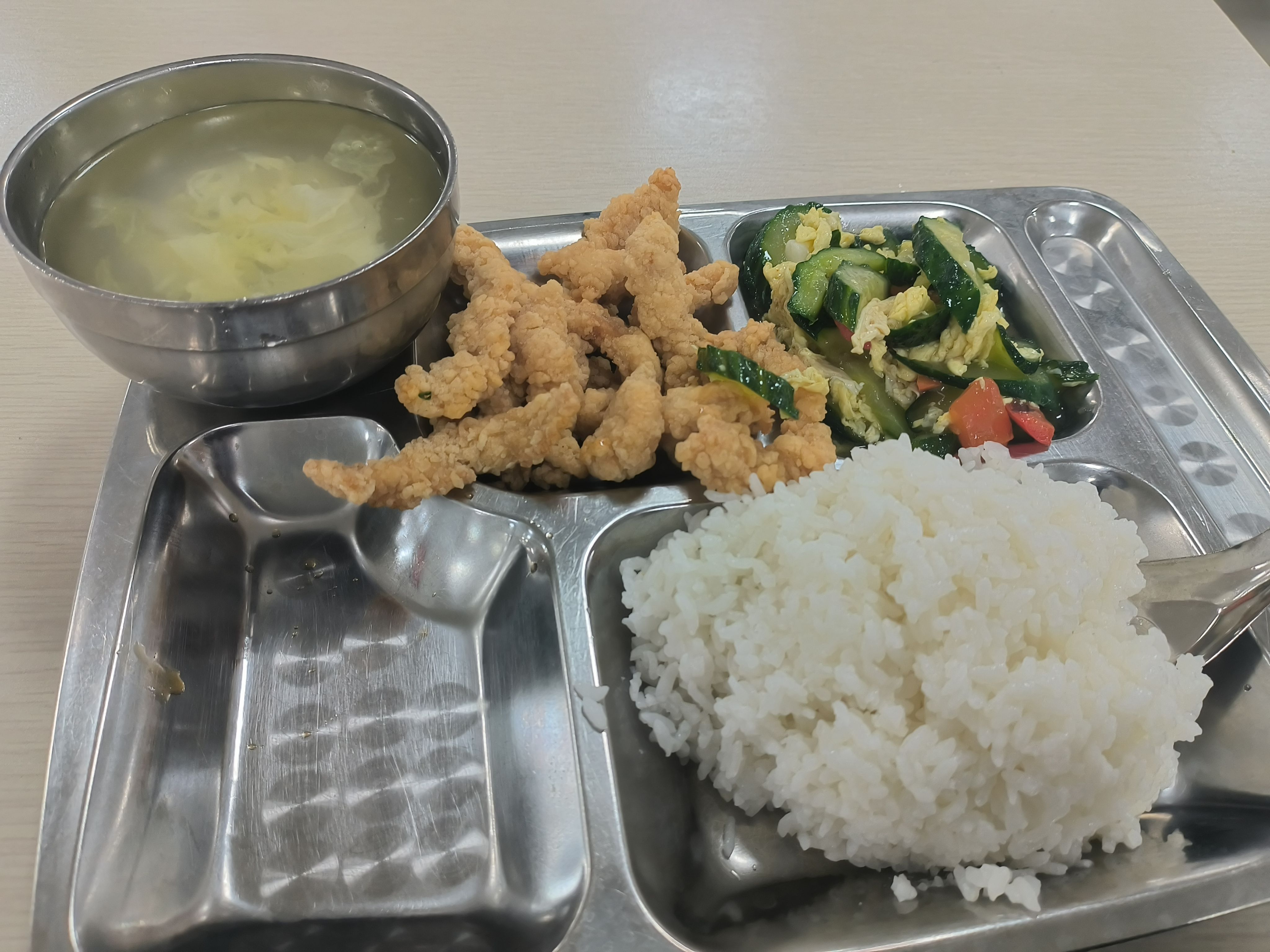黄瓜炒蛋、炸鸡柳、白菜蛋花汤