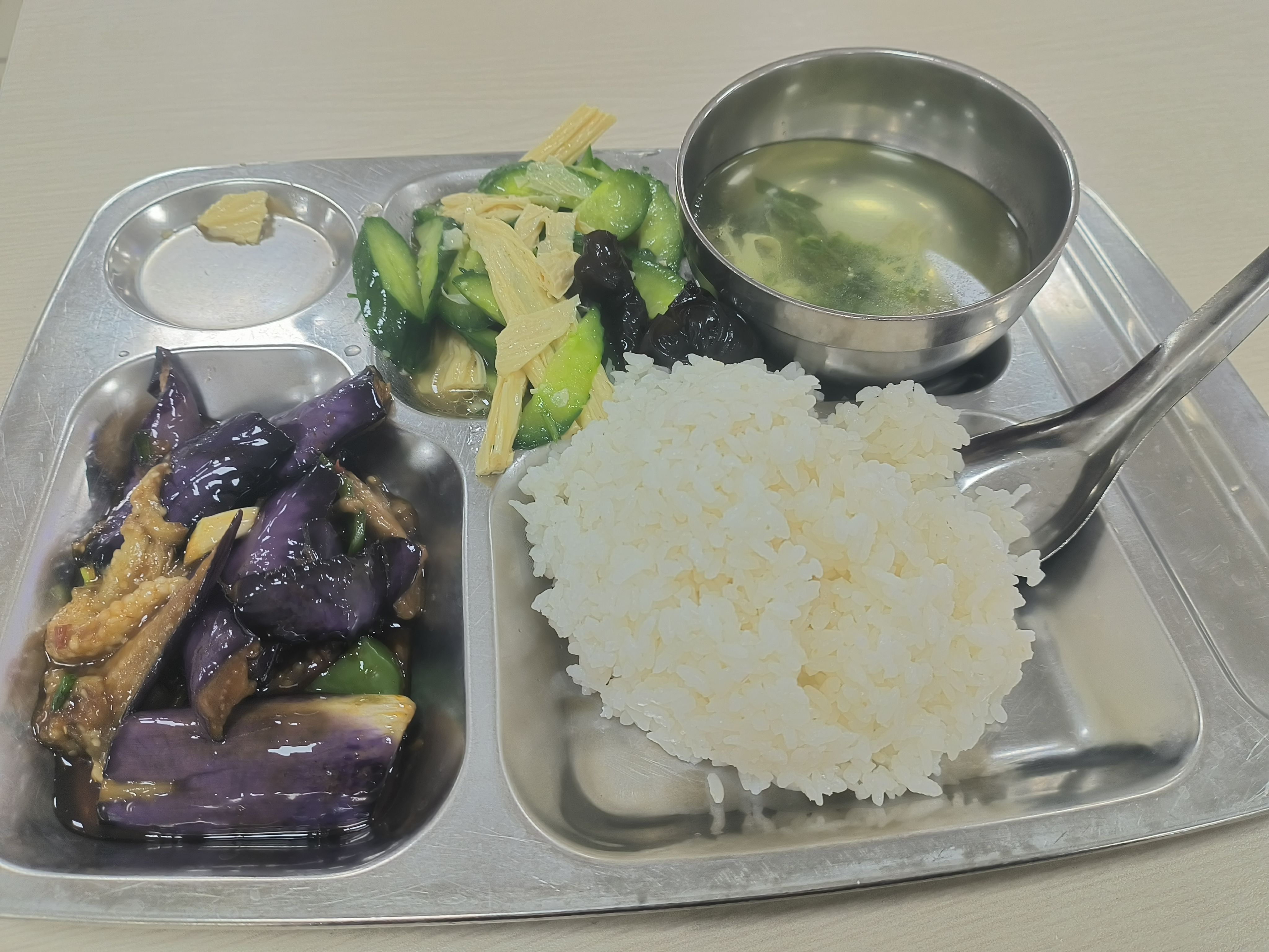 红烧茄子、黄瓜腐竹、白菜蛋汤