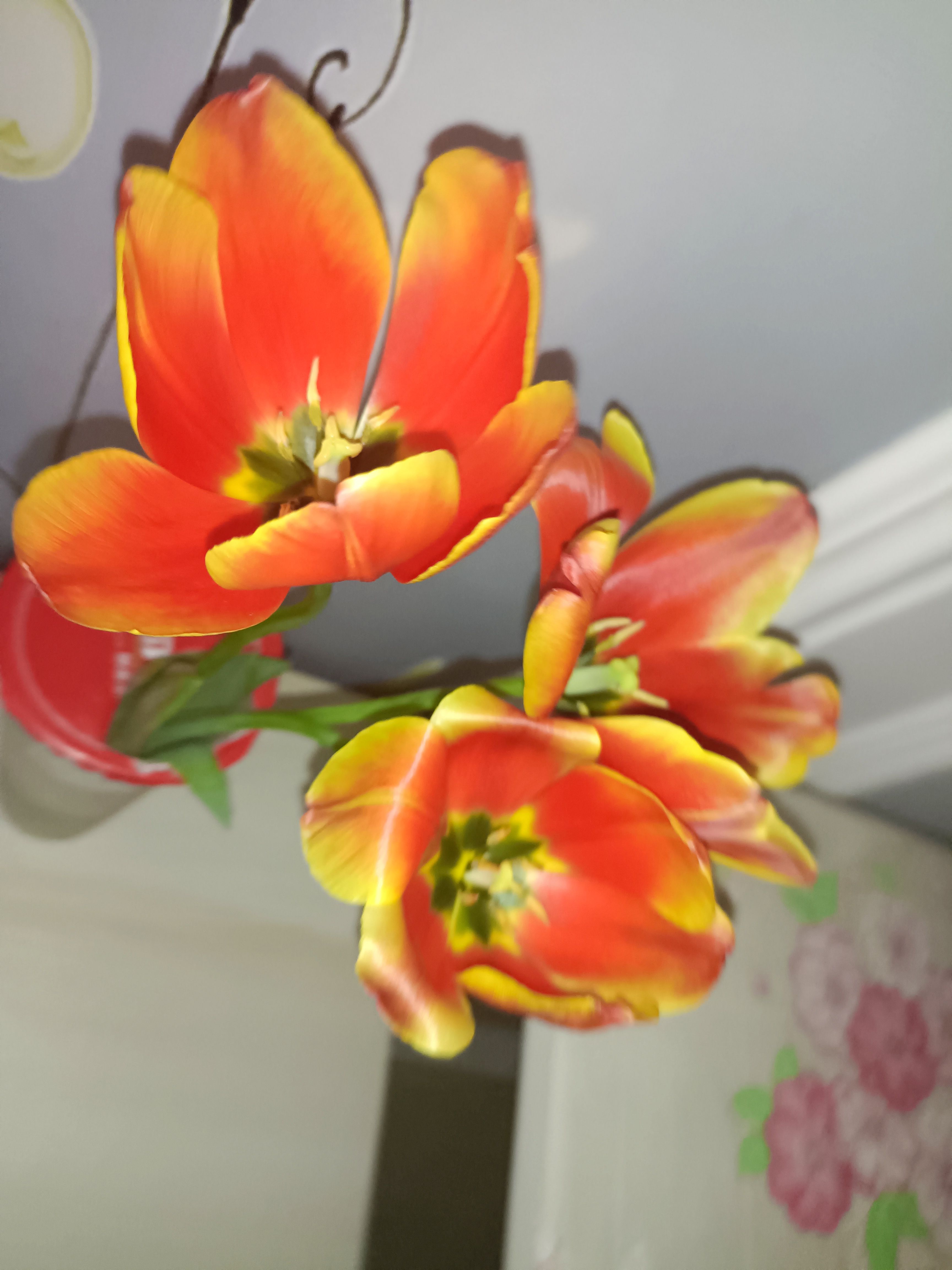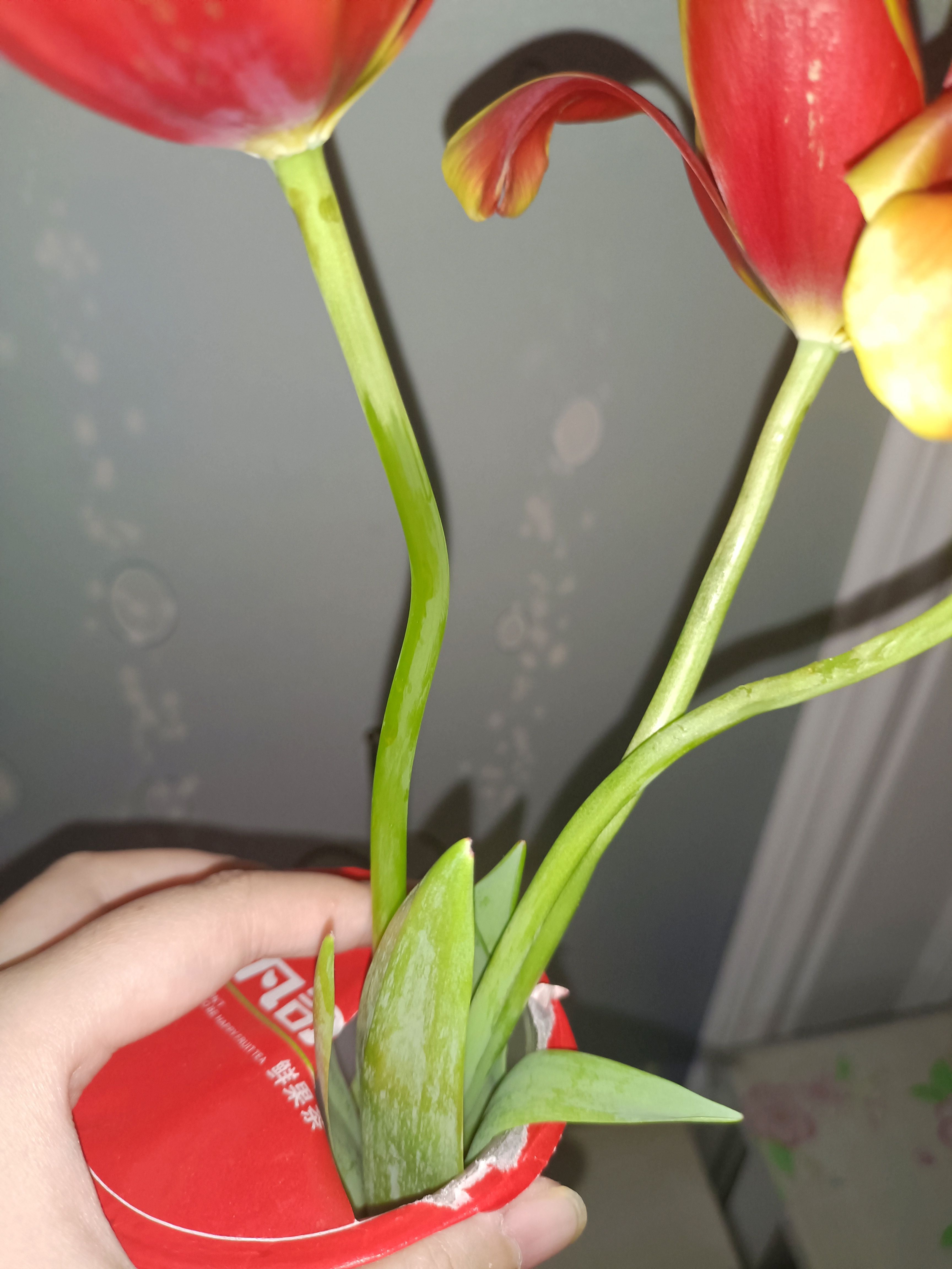 或许是温度太高,或许是长时间缺水,总之有一棵郁金香的茎化水了,有一棵茎都皱了