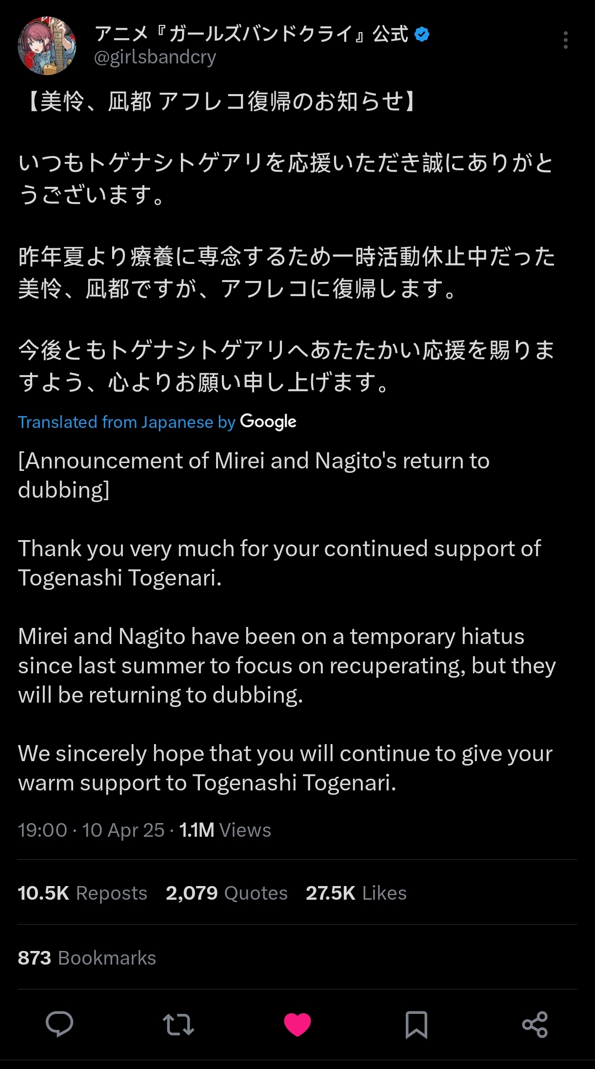 美怜和凪都并没有发推,她们的推没有复活,其他成员也只是转发了并没有祝贺,按理说回归了其他成员肯定要祝贺,何况她们私下的关系很好,虽然回归配音是好事但是这一现象很奇怪,并没有提复归乐队活动的事