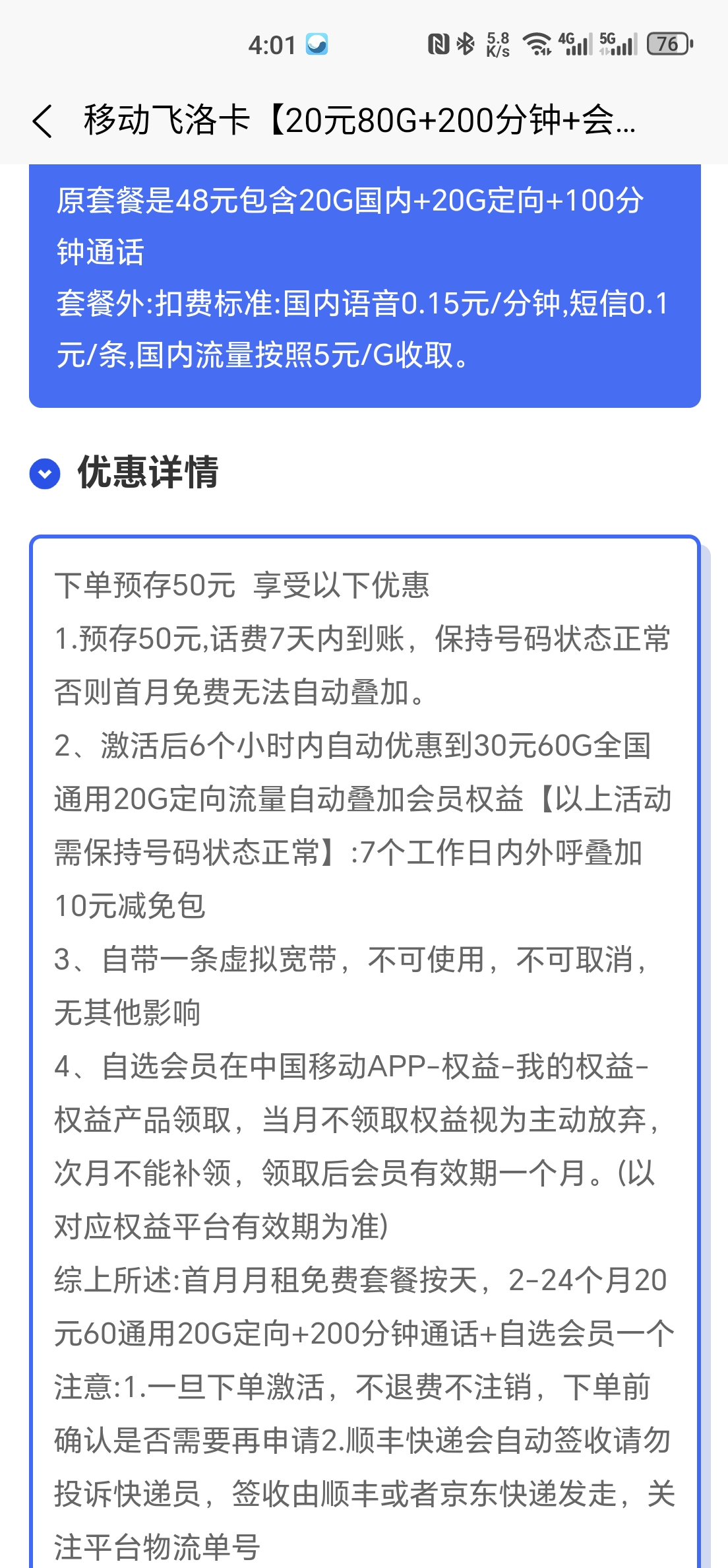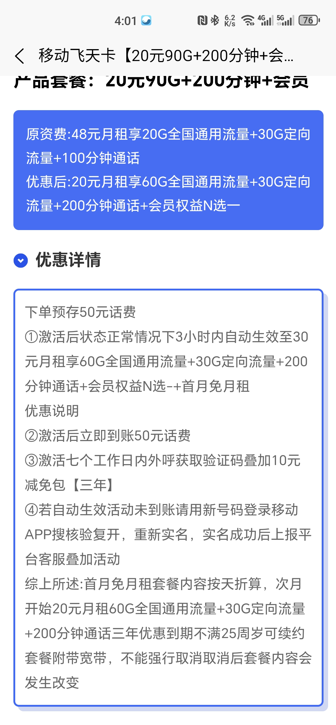 飞洛是20元60G通用20G定向 优惠2年合约2年 给个会员