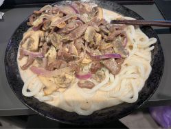 奶油蘑菇乌冬面(*゚∇゚)就是今天有点着急,没煮够时间,奶油还有点稀
