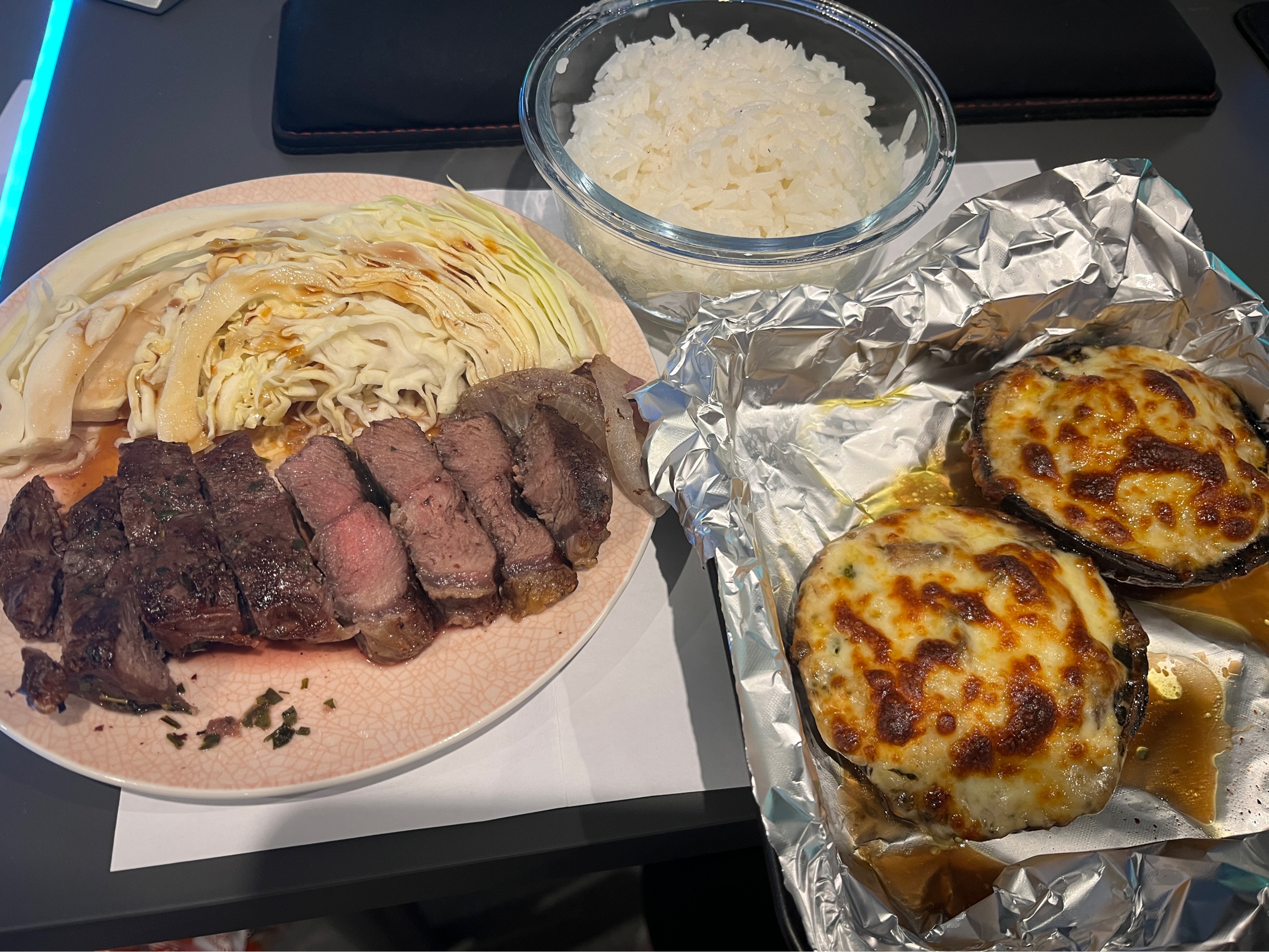 咦发出来了。昨天晚饭我发半天发不出来,补发一下吧。烤牛排和烤牛排菇