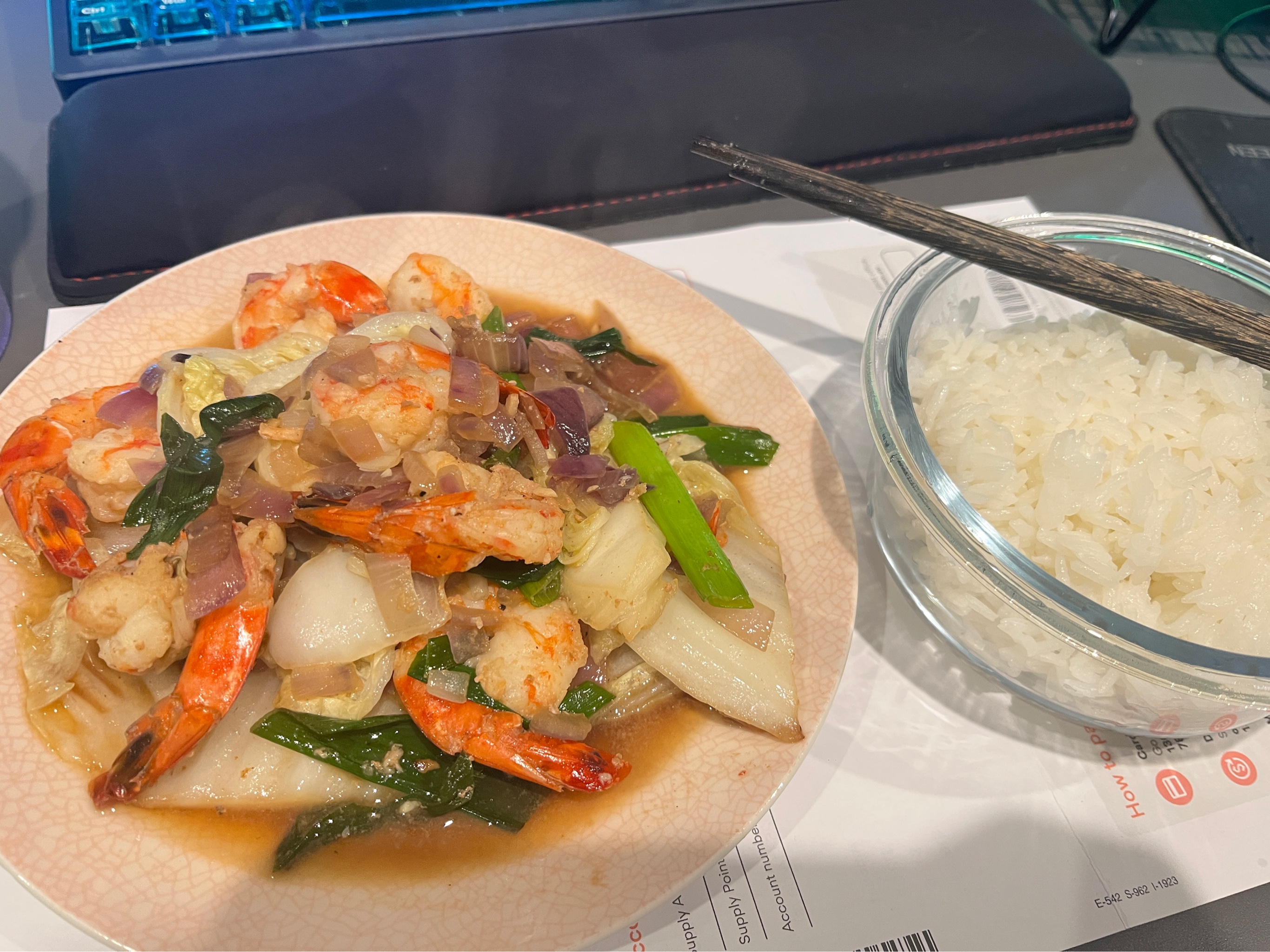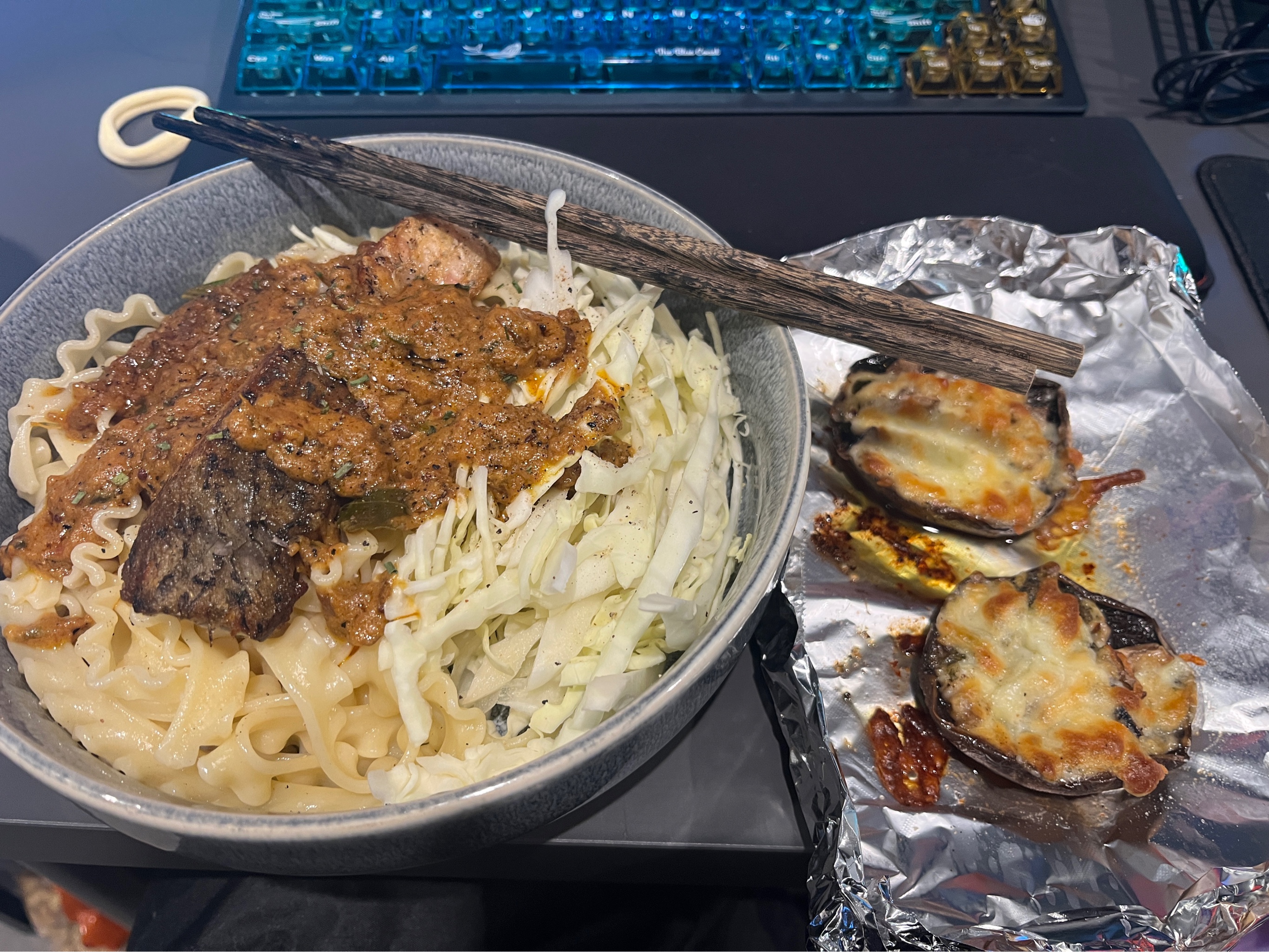 昨天去吃了超好吃的巴基斯坦菜,把咖喱虾的酱打包回来了,今天拌面吃。还煎了一块盲曹鱼,烤了两个牛排菇